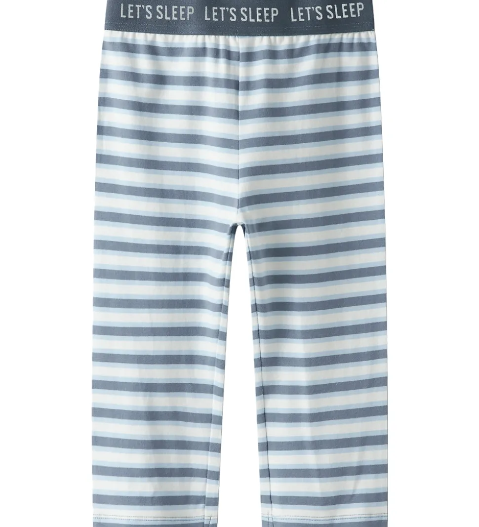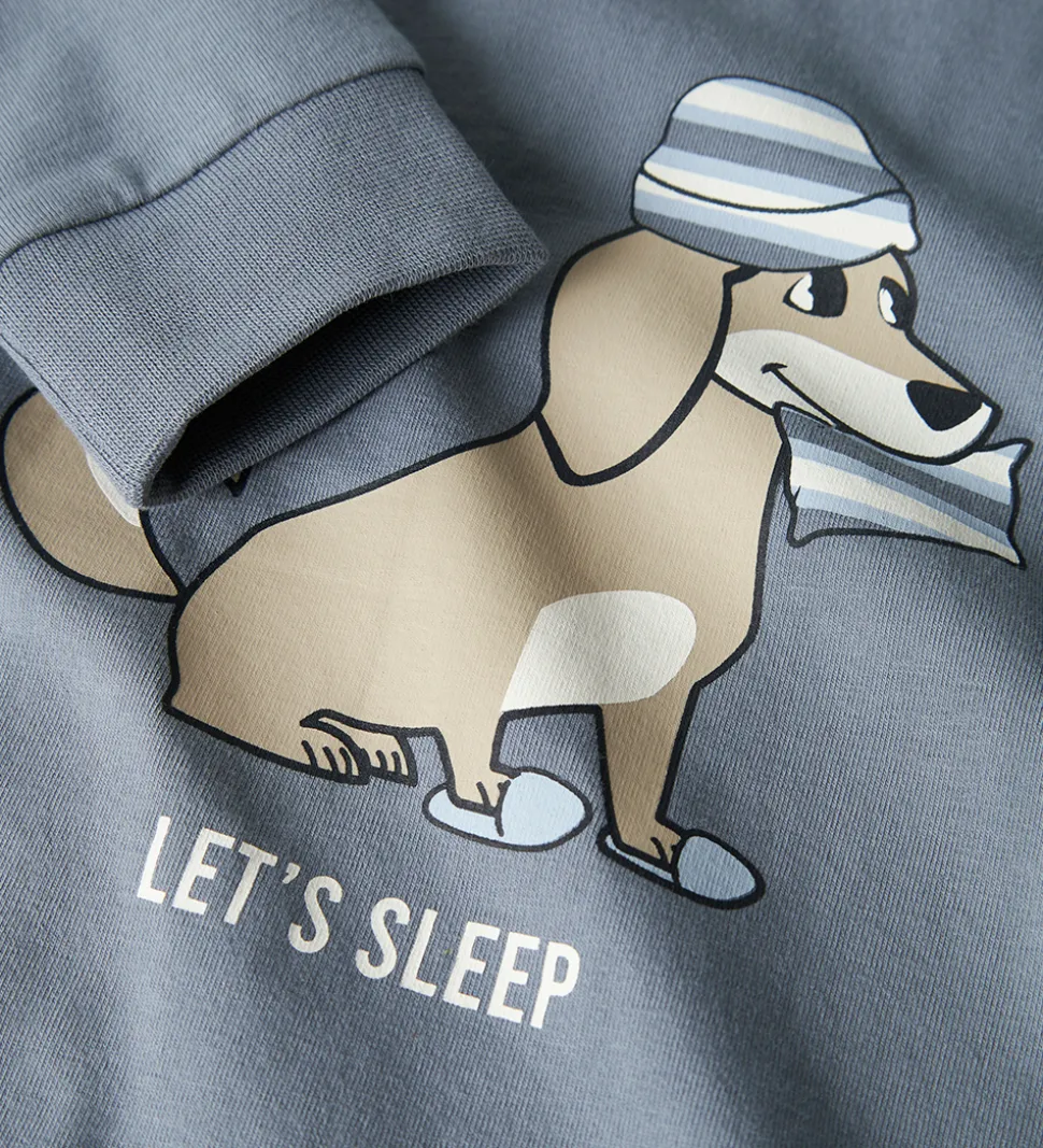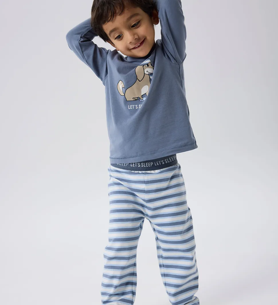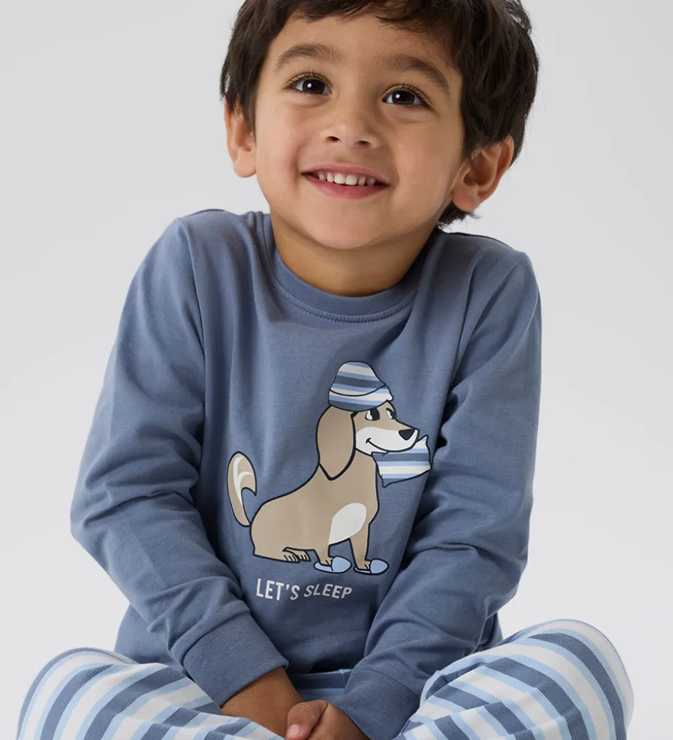 Dejligt Name It nattøj bestående af en langærmet natbluse i støvet blå og et par natbukser i stribet støvet blå, lyseblå og hvid. Natblusen har et print af en hund med nathue og en pude samt teksten “Let’s Sleep”. Den har en rund halsudskæring med en smal ribkant og ribkanter ved håndleddene. Natbukserne har en god elastik i taljen og lige ben.