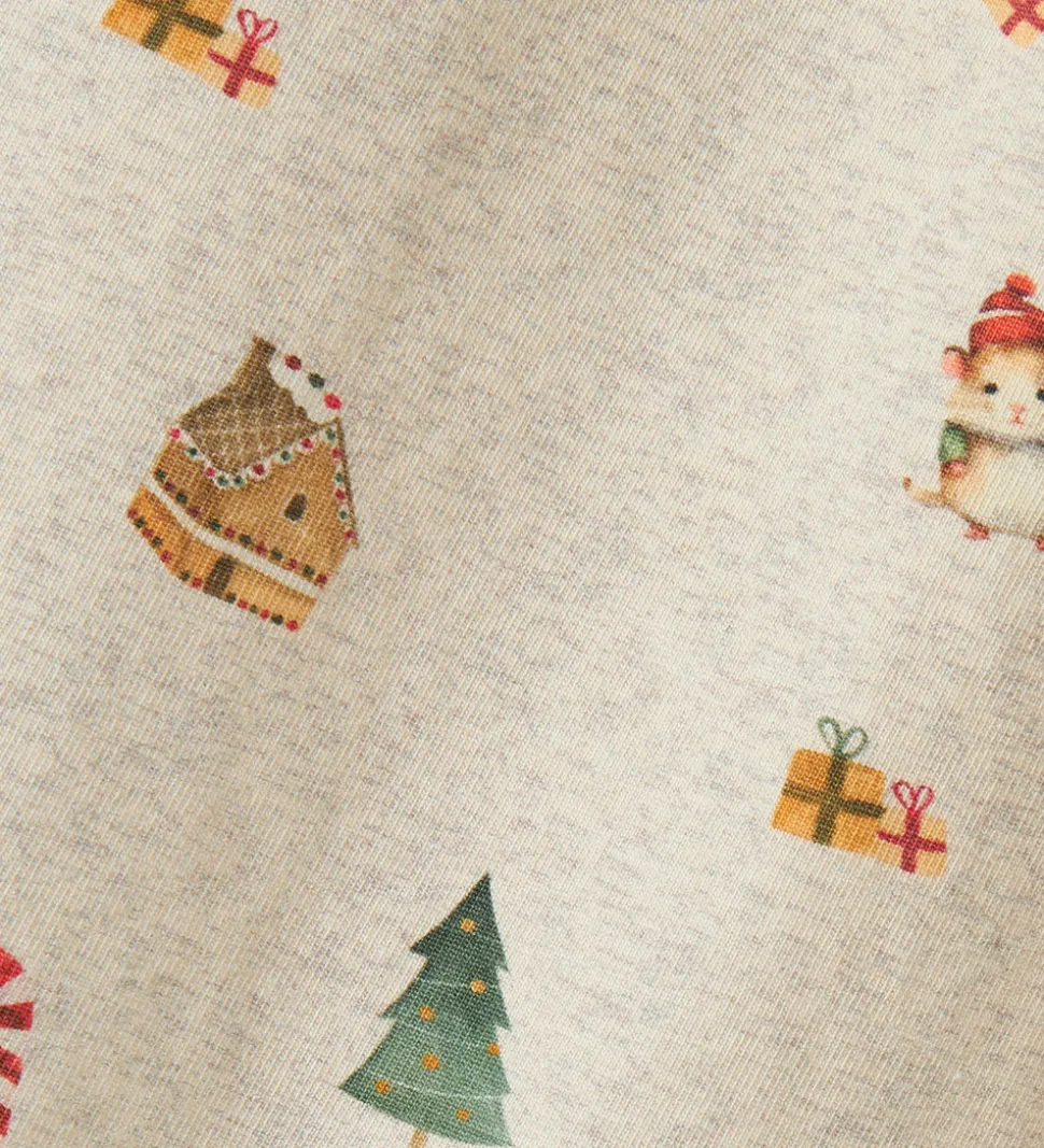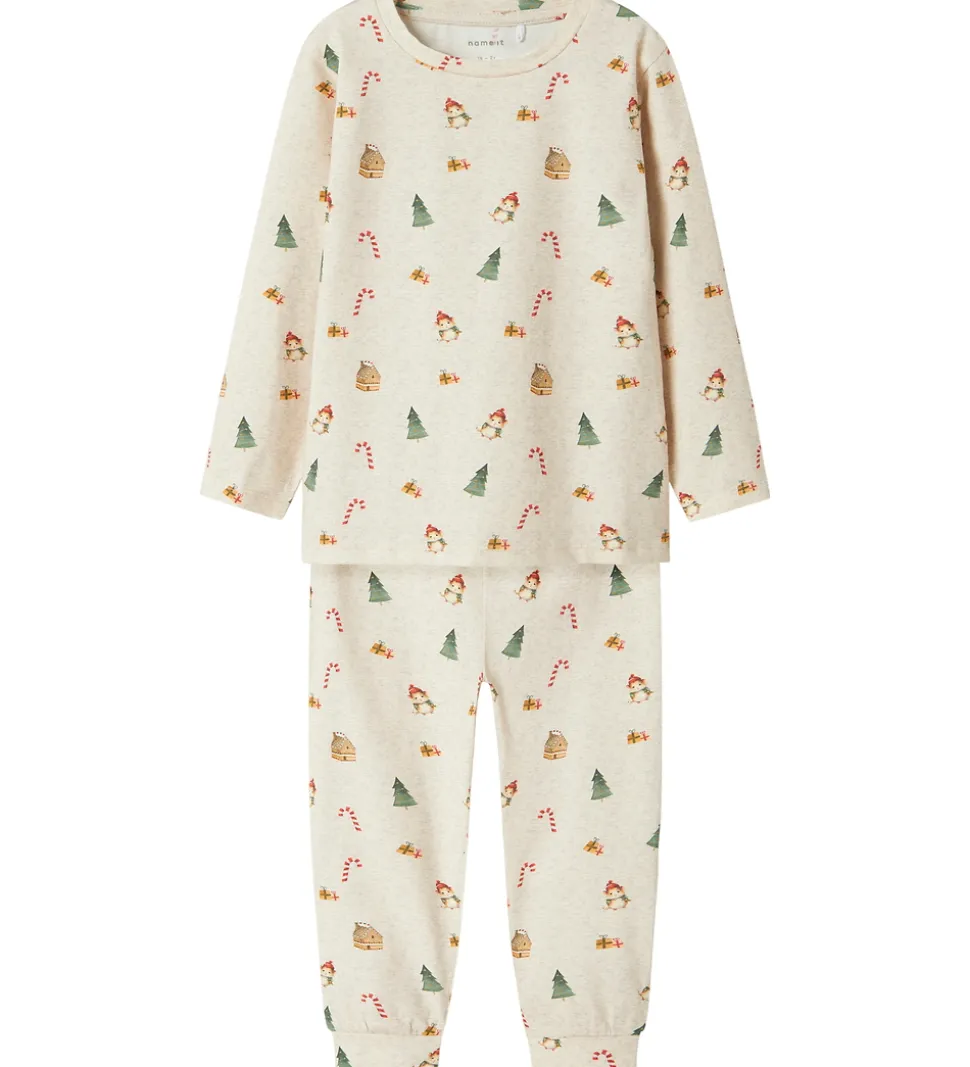 Herligt Name It nattøj i lys meleret beige med print af julemotiver, heriblant juletræer, slikstokke og gaver. Nattøjet består af en langærmet natbluse og et par natbukser med en god elastik i taljen og brede kanter ved anklerne.