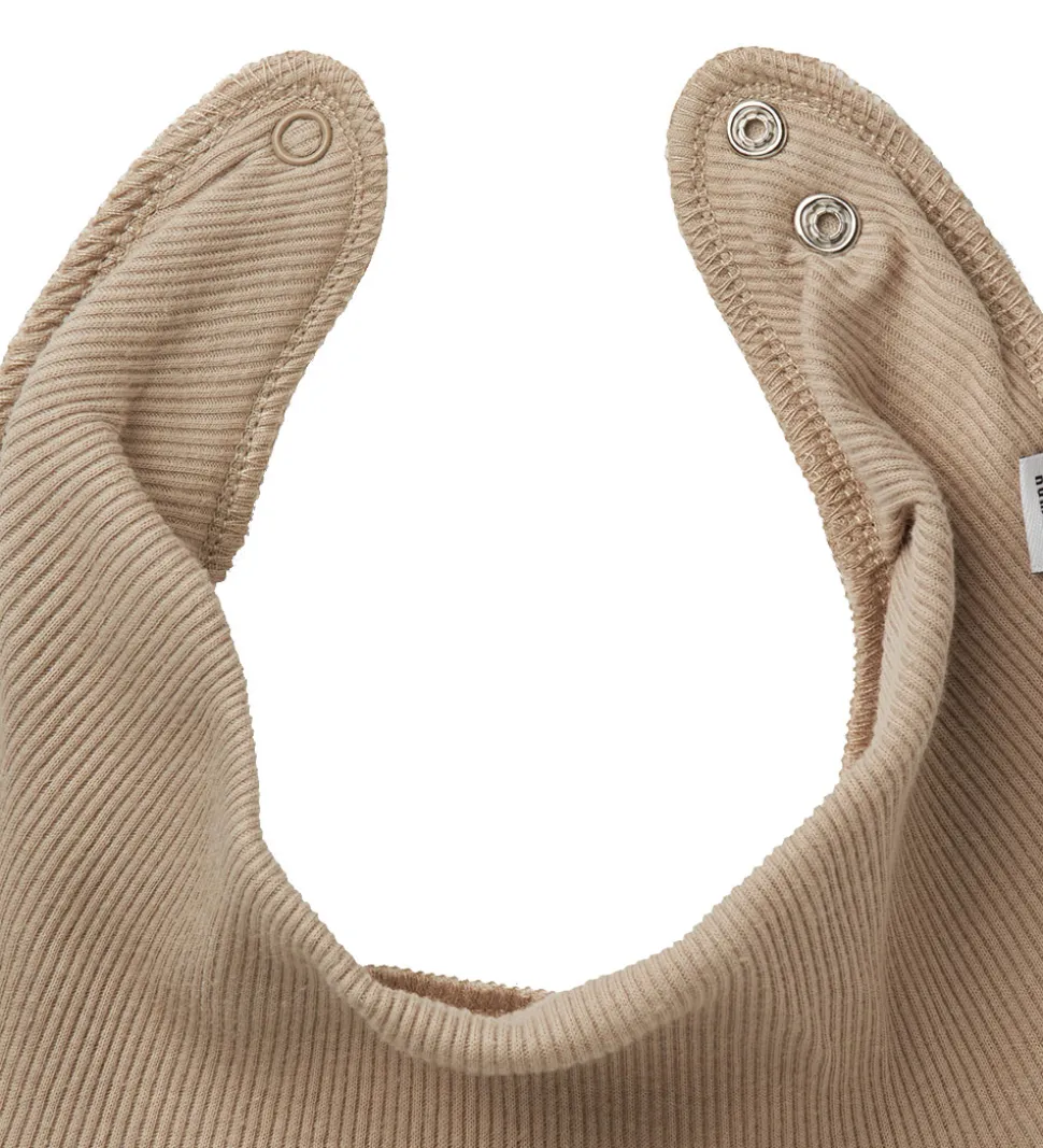 Name It savlesmækkene kan åbnes i nakken med trykknapper, hvor der er to forskellige indstillinger. Savlesmækken har en spids form og bagsiden er i hvid fleece.