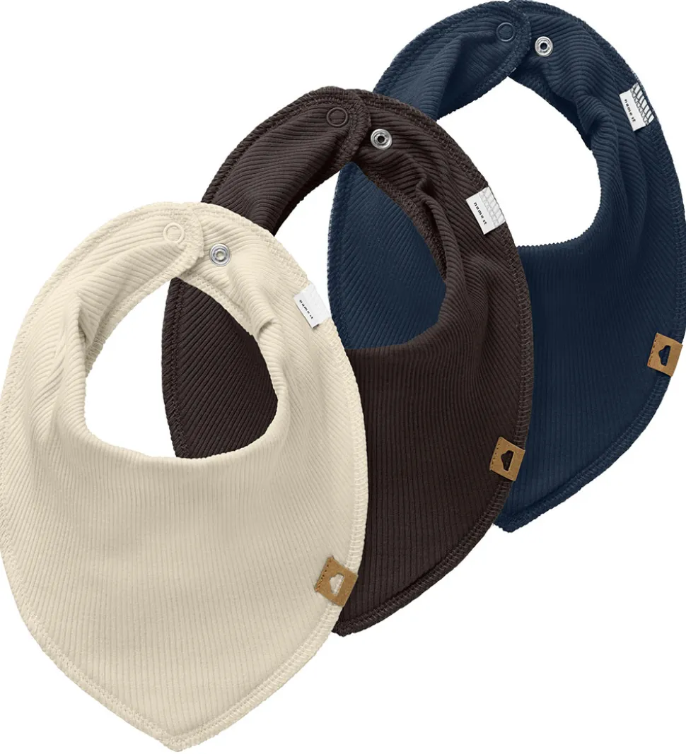 Funktionelle Name It savlesmøkke solgt i en 3-pak i ensfarvet beige, mørkebrun og mørkeblå. Savlesmækkene har ribstruktur og en trekantet facon. De lukkes i nakken med en trykknap, som kan justeres i to forskellige længder. På bagsiden er der blødt, hvidt fleece.