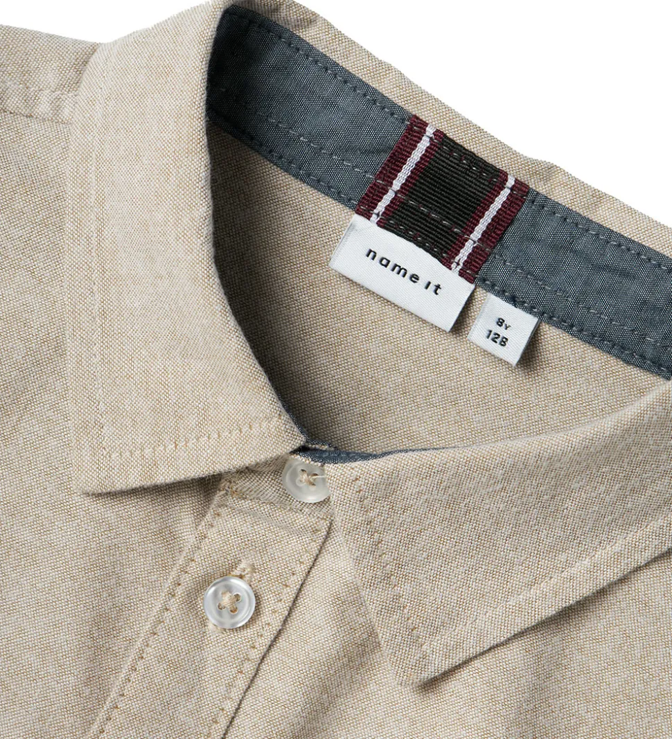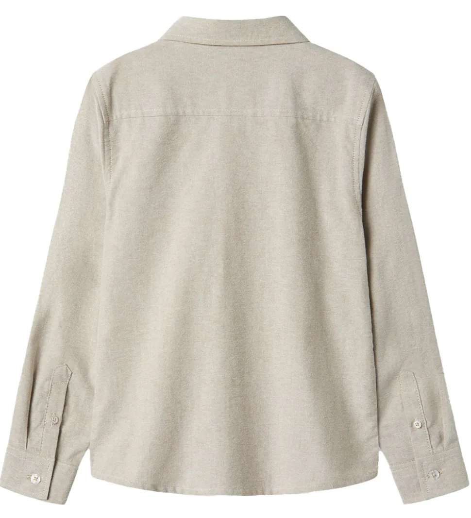 Fin Name It skjorte i meleret beige. Fortil på venstre bryst er der et lille broderet skjold i hvid med et “N” i midten.