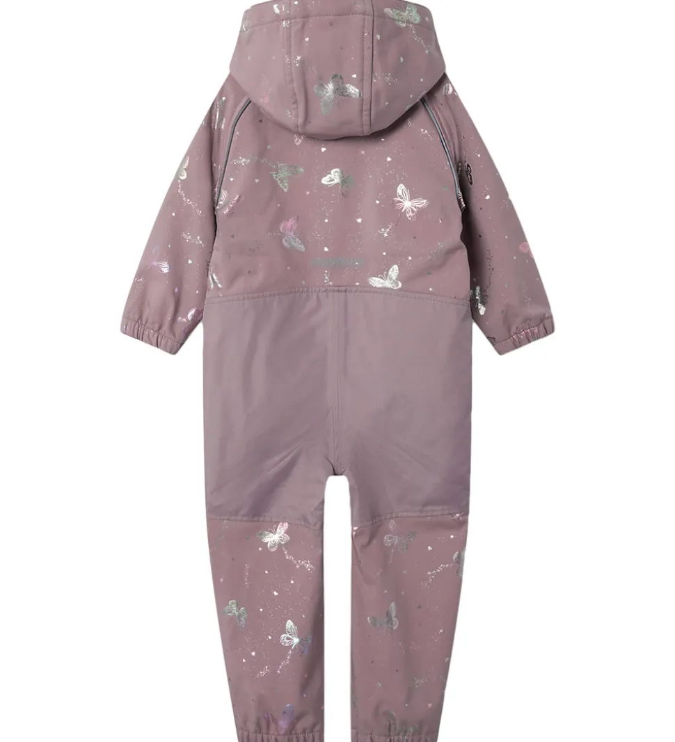 Dejlig Name It softshelldragt i støvet lilla med et alloverprint af sommerfugle i skinnende, changerende farver.