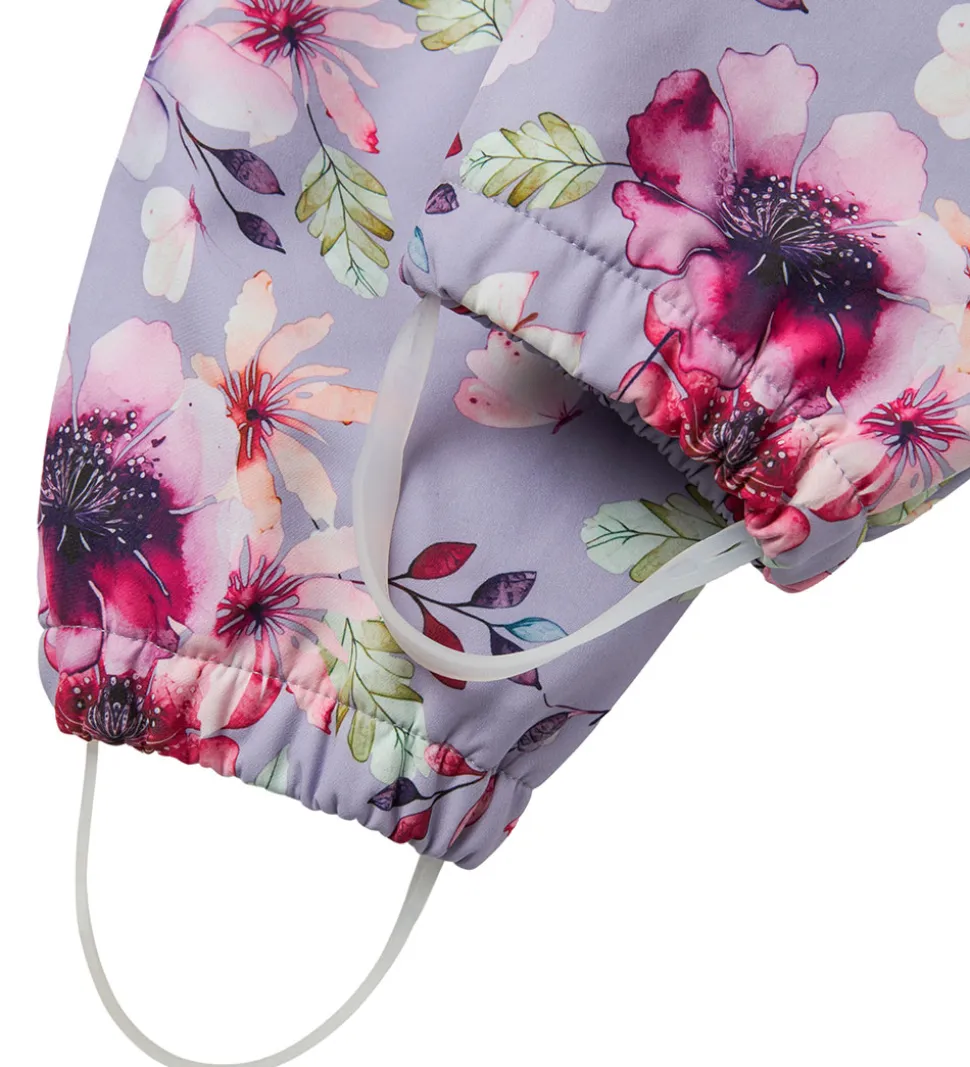 Dejlig Name It softshelldragt i lilla med et alloverprint af blomster og sommerfugle i rosa, lilla og grønne nuancer.