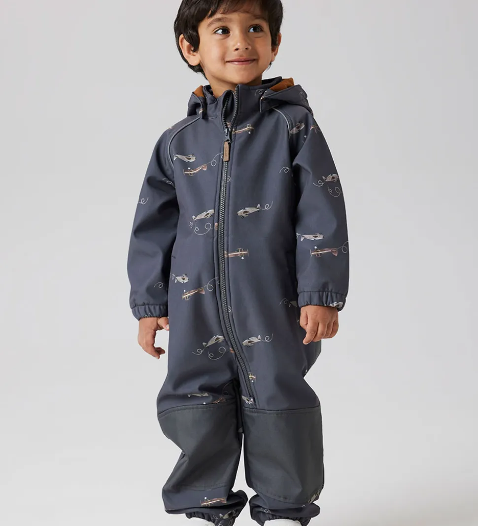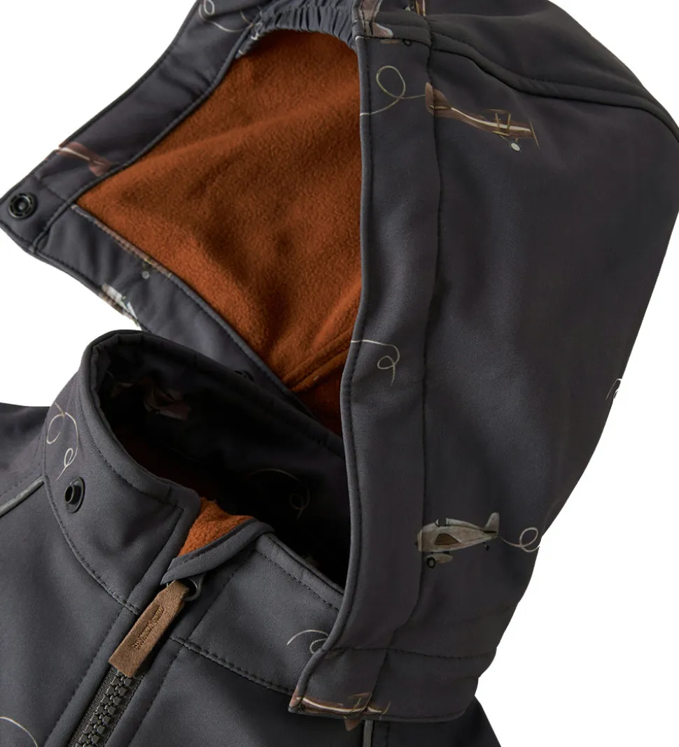 Dejlig Name It softshelldragt i mørkegrå og med print af flyvermaskiner. Foret er i en brun nuance.