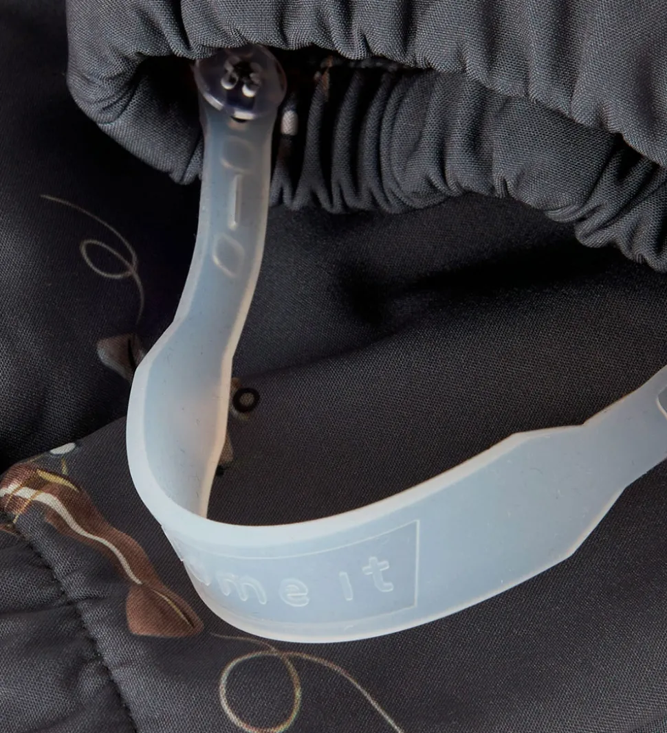 Name It softshelldragten har en aftagelig hætte, som sidder fast med skjulte tryknapper på den høje halskrave. Hætten har en smart elastikkant og skygge øverst i ansigtsåbningen. Ærmerne har praktiske elastikkanter, og buksebenene har elastikkanter med justerbare, aftagelige gummistropper til at sætte under fodtøjet.