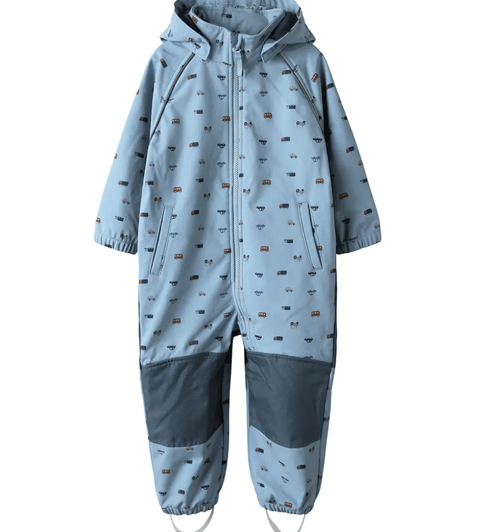 Dejlig Name It softshelldragt i lys, støvet blå med et alloverprint af biler i grå, blå og brune farver.