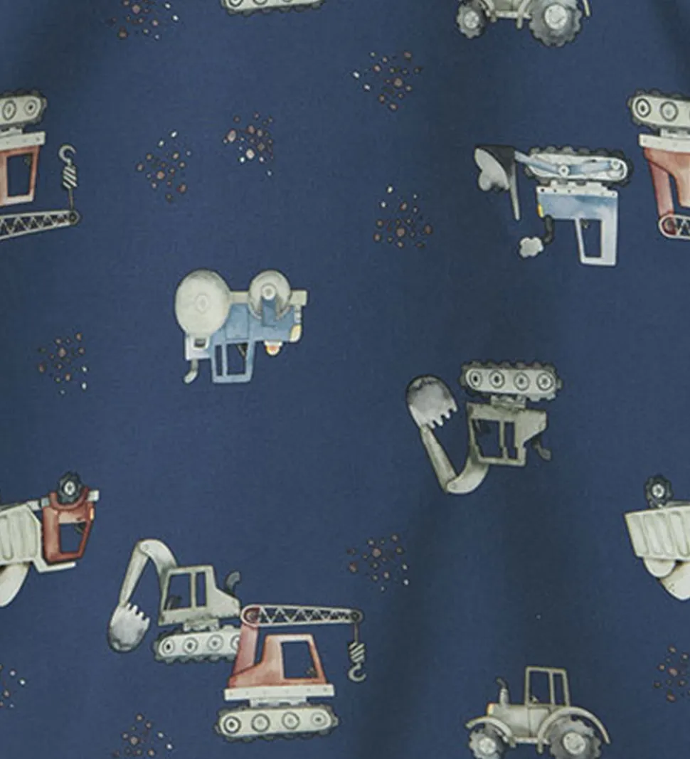 Dejlig Name It softshelldragt i mørkeblå med et alloverprint af arbejdsbiler i mange farver.