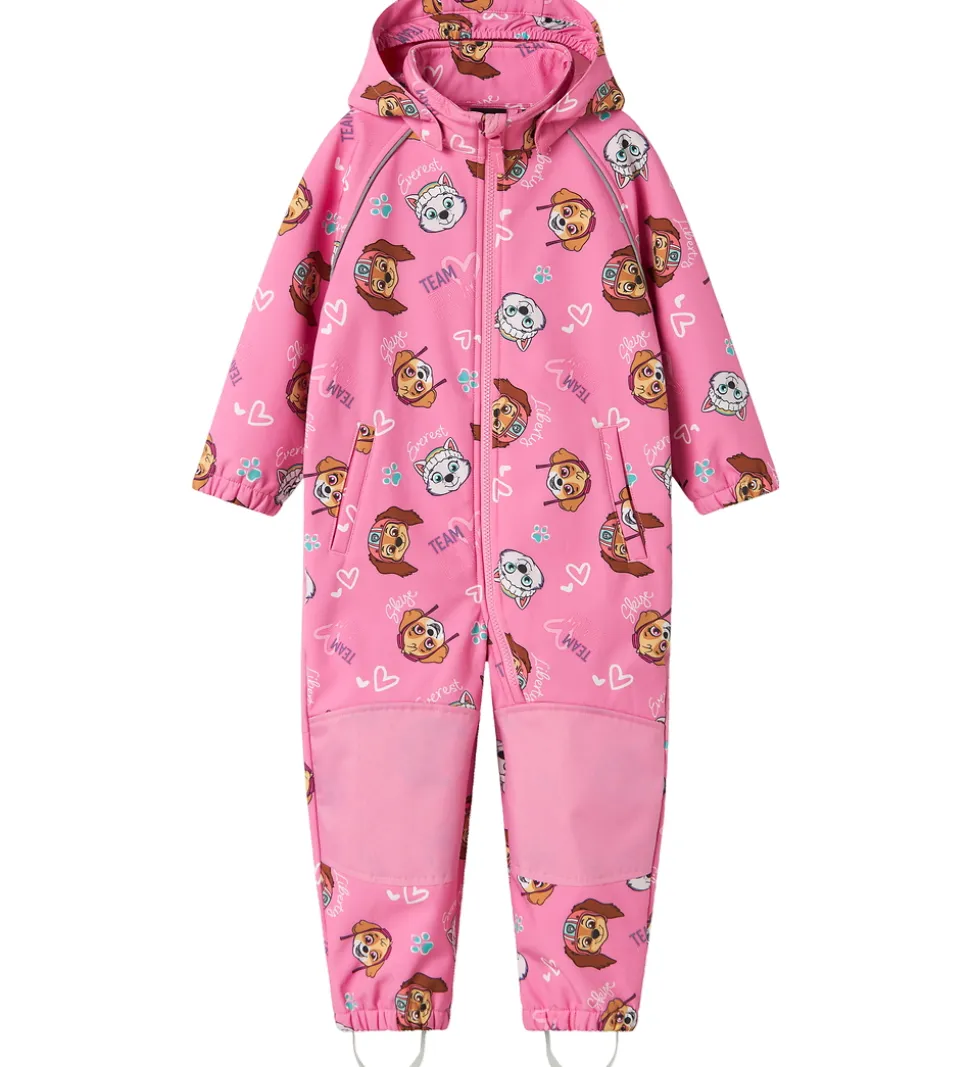 Fin Name It softshelldragt i pink med et farverigt allover-Paw Patrol-print.