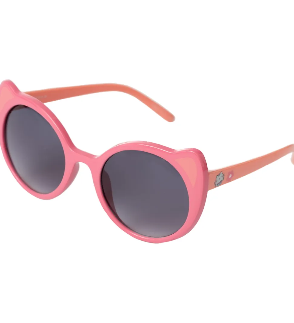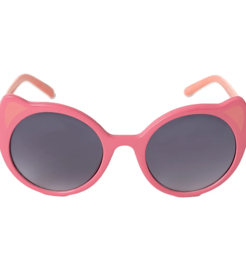 Charmerende Name It solbriller med et lyserødt stel og runde brilleglas. Stellet har katteørelignende detaljer, der tilføjer et legende præg, og et lille motiv ses på siderne.