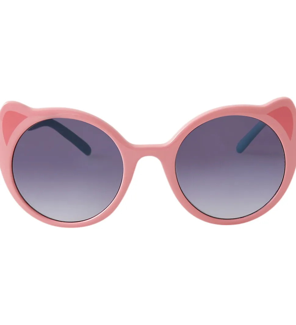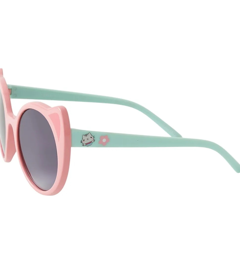 Charmerende Name It solbriller med runde brilleglas og et unikt stel i en kombination af lyserød og pastelgrøn. Solbrillerne er udsmykket med et sødt kattemotiv og en blomst på stellet, der giver dem et legende udtryk.