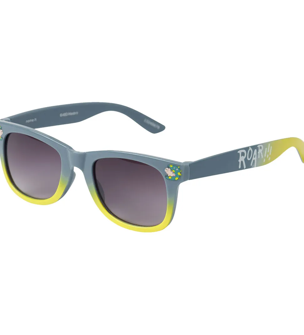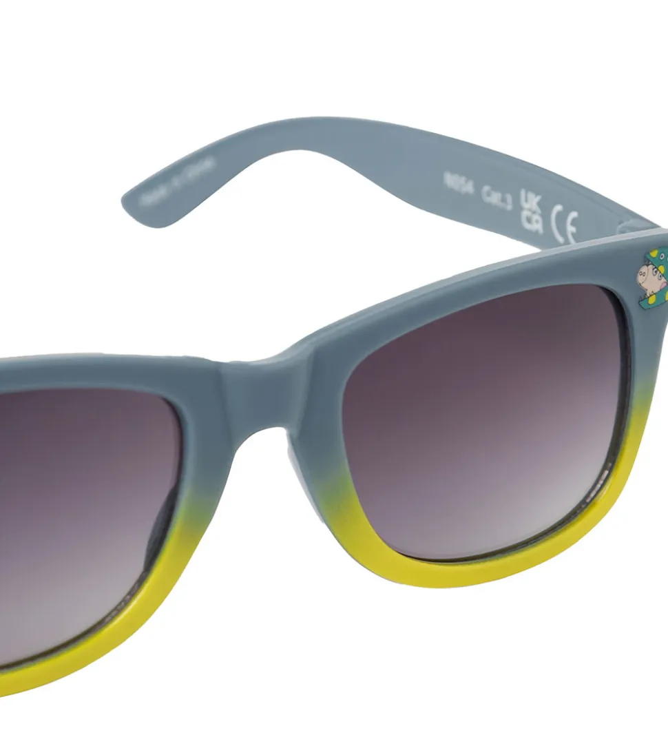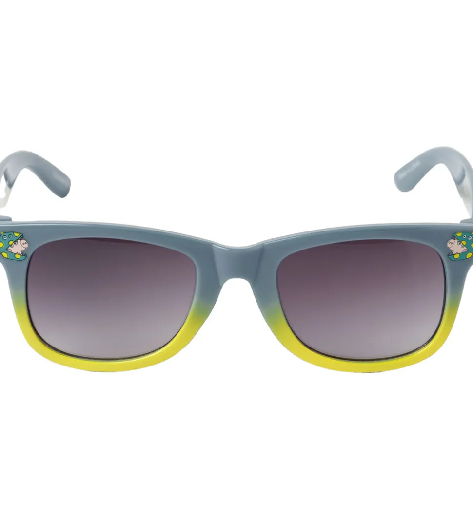 Smarte Name It solbriller i støvet blå og gul med et lille Gurli Gris-print i siderne. Solbrillerne har sorttonede brilleglas.