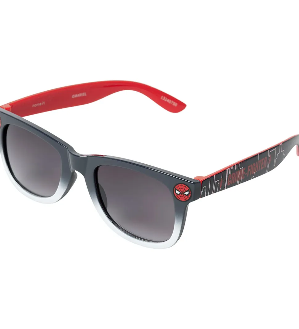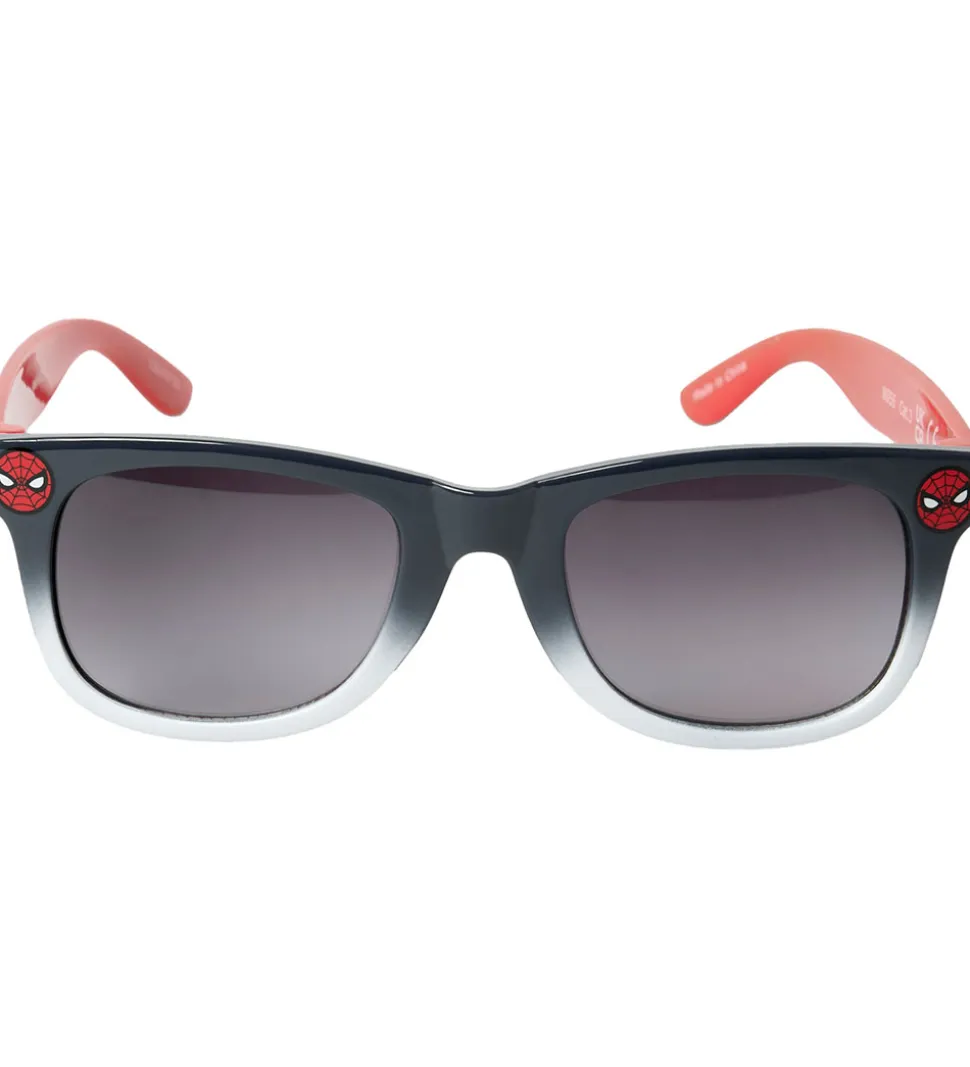 Smarte Name It solbriller i navyblå, rød, sort og hvid med et lille Spider-Man-print i siderne. Solbrillerne har sorttonede brilleglas.