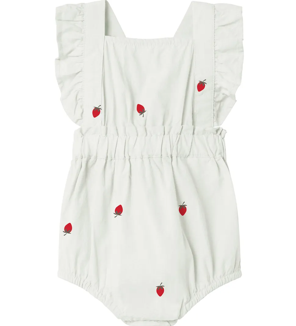 Praktisk Name It sommerdragt i en hvid farve med søde broderede jordbær på hele designet. Sommerdragten har smukke flæser ved skuldrene, hvilket giver et fint og legende look.