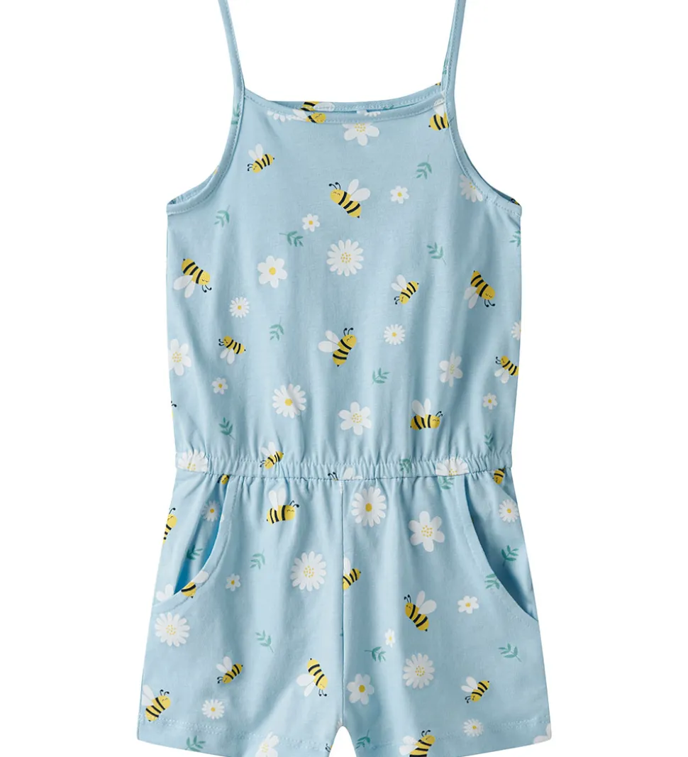Skøn Name It sommerdragt i lyseblå med et sødt print af bier og hvide blomster. Sommerdragten har tynde stropper og en elastisk talje, der giver en behagelig pasform. I siderne er der praktiske lommer. Sommerdragten har korte ben, og lukkes med trykknapper mellem benene.