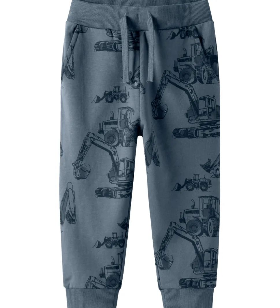 Stilfulde Name It sweatpants i støvet blå med et print af mørkeblå gravemaskiner. Sweatpantsene er designet med en bred elastikkant i livet, som kan justeres med knapper indvendigt. Fortil er der dekorative snører og en lomme i hver side. Sweatpantsene har ribkanter ved anklerne, og indvendigt er der blødt, børstet bomuld.