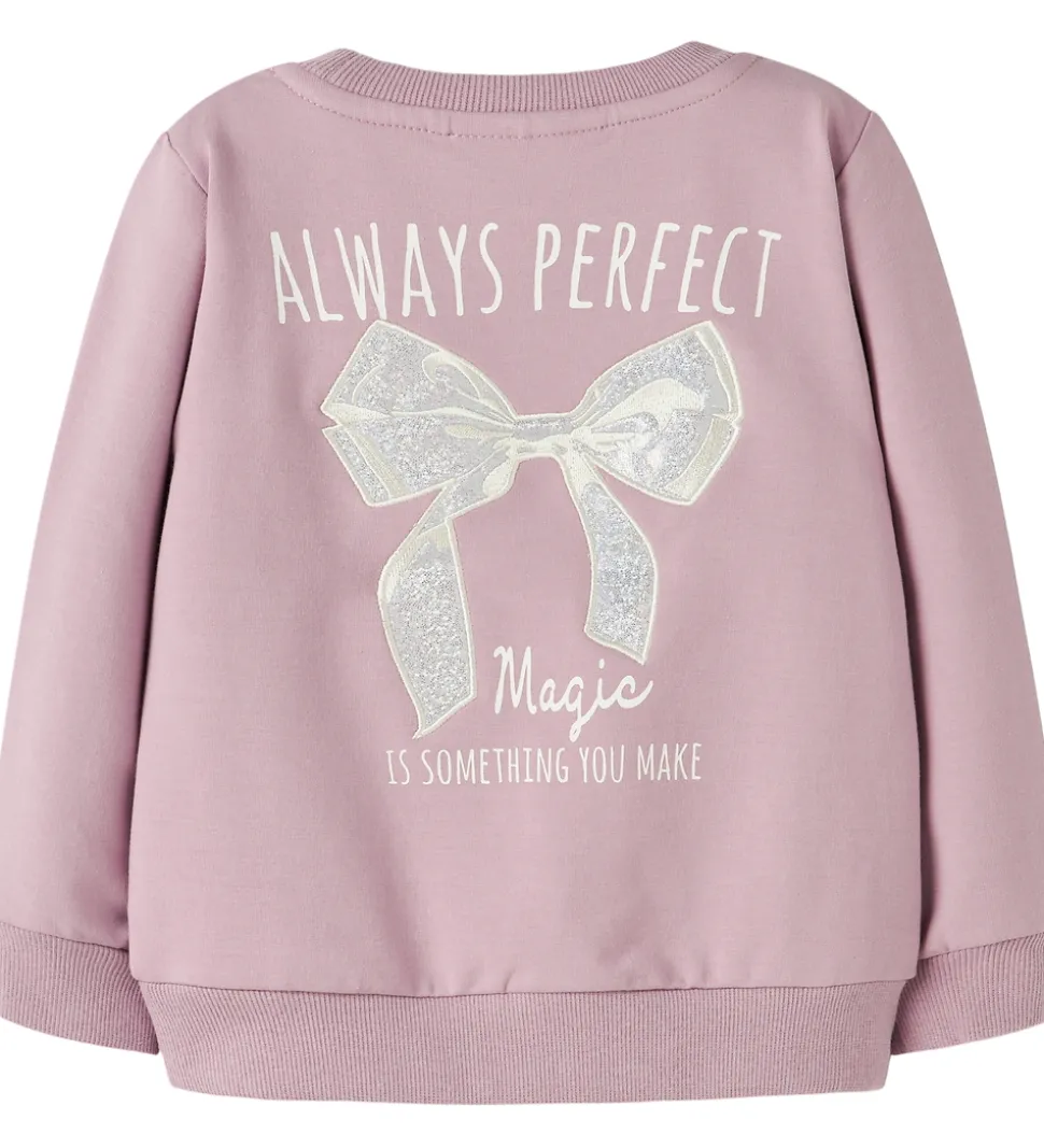 Elegant Name It sweatshirt i en sart, lyserød nuance med et fint sløjfeprint. Name It sweatshirten har lange ærmer og en rund halsudskæring, hvilket giver et enkelt og rent udtryk. Ribkanter på ærmer og bund bidrager til et klassisk design.