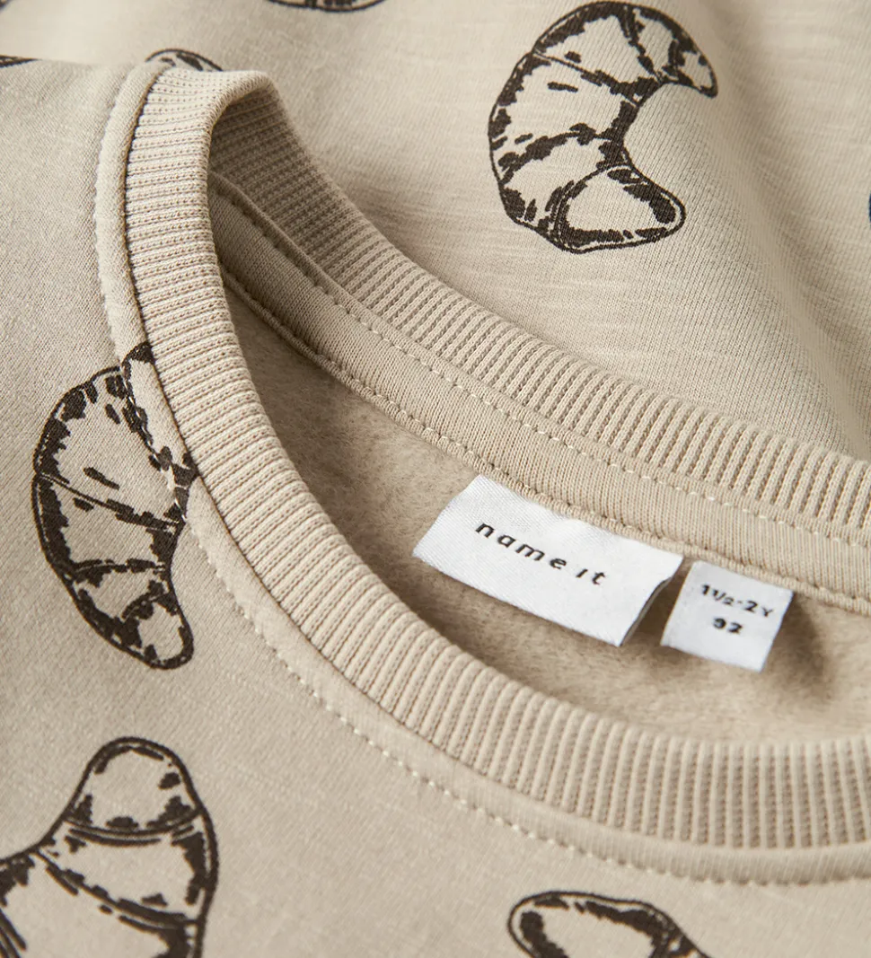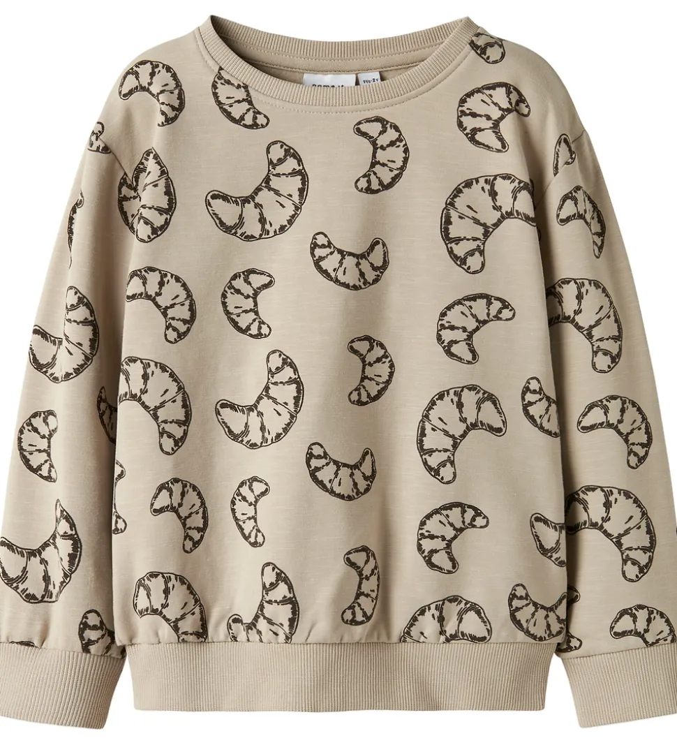 Skøn Name It sweatshirt i beige med et alloverprint af croissanter i mørkebrun. Name It sweatshirten har en rund halsudskæring og lange ærmer med ribkanter. Indvendigt er der blødt, børstet bomuld.