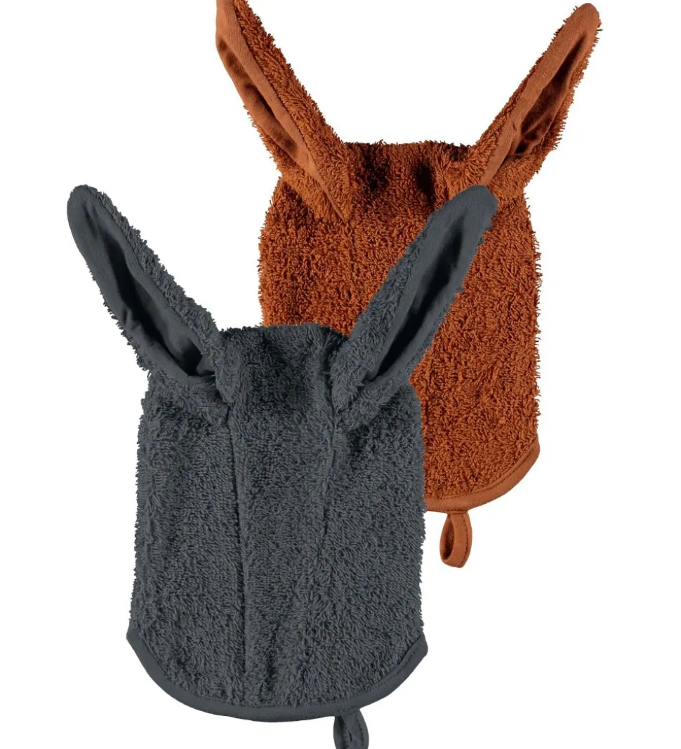 Skønne Name It vaskehandsker solgt i en praktisk 2-pak. Den ene er ensfarvet mørkegrå med ører og den anden er ensfarvet brun med ører.