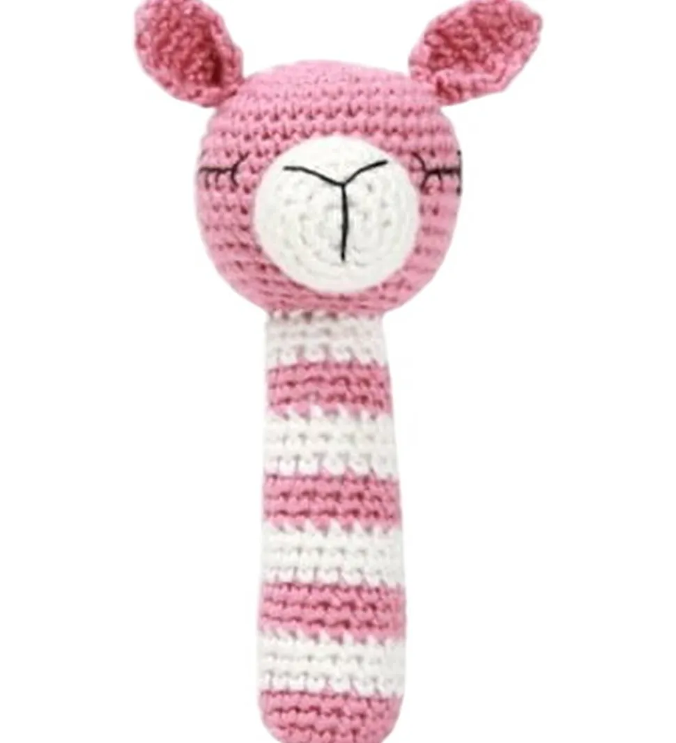 Charmerende NatureZoo rangle med striber i rosa og hvid. Ranglen har en hæklet overflade, som giver en blød fornemmelse ved berøring. Ranglen er formet som en lama og er designet med detaljerede øjne og en venlig mund.
