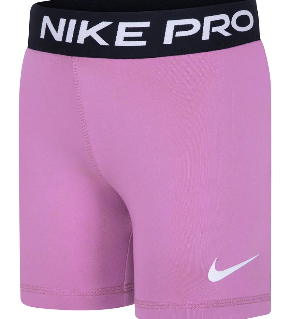 Smarte Nike cykelshorts i lilla med en bred, sort elastikkant i livet med teksten “Nike Pro” trykt i hvid.