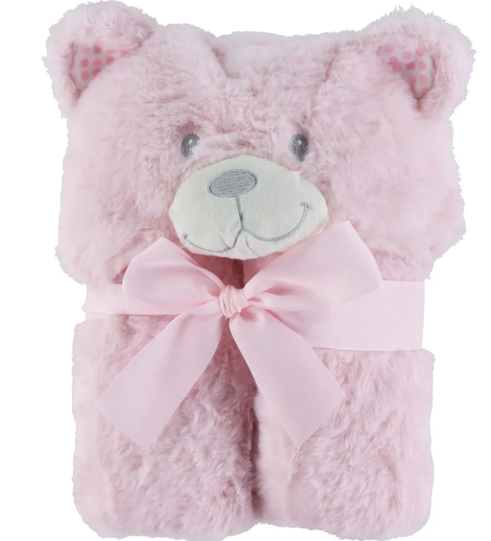 Skønt Nørgaard Madsens tæppe i en rosa nuance med et sødt bamsehoved, der tilføjer et legende præg. Tæppet har en plysset struktur på den ene side, og en let fleece struktur på den anden, som gør det indbydende og hyggeligt.