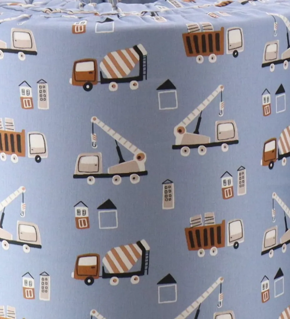 Fin Nørgaard Madsens sengerand i lyseblå med et alloverprint af forskellige arbejdsmaskiner i brun, navyblå og grå.