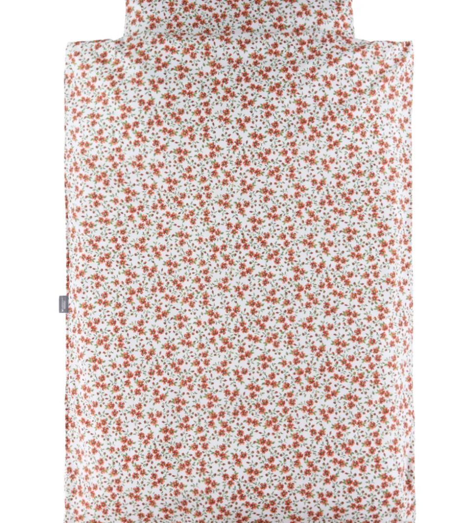 Flot Nørgaard Madsens sengetøj i hvid med et alloverblomsterprint i rød og grøn.