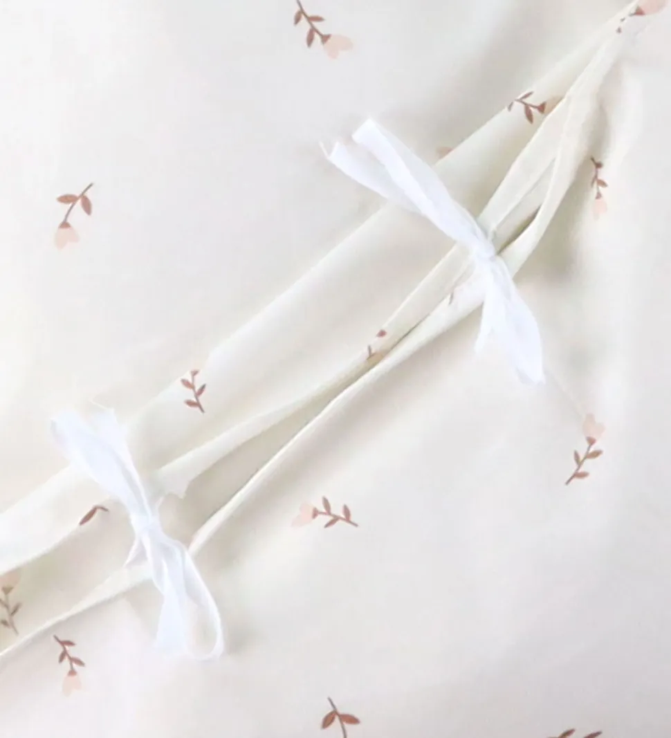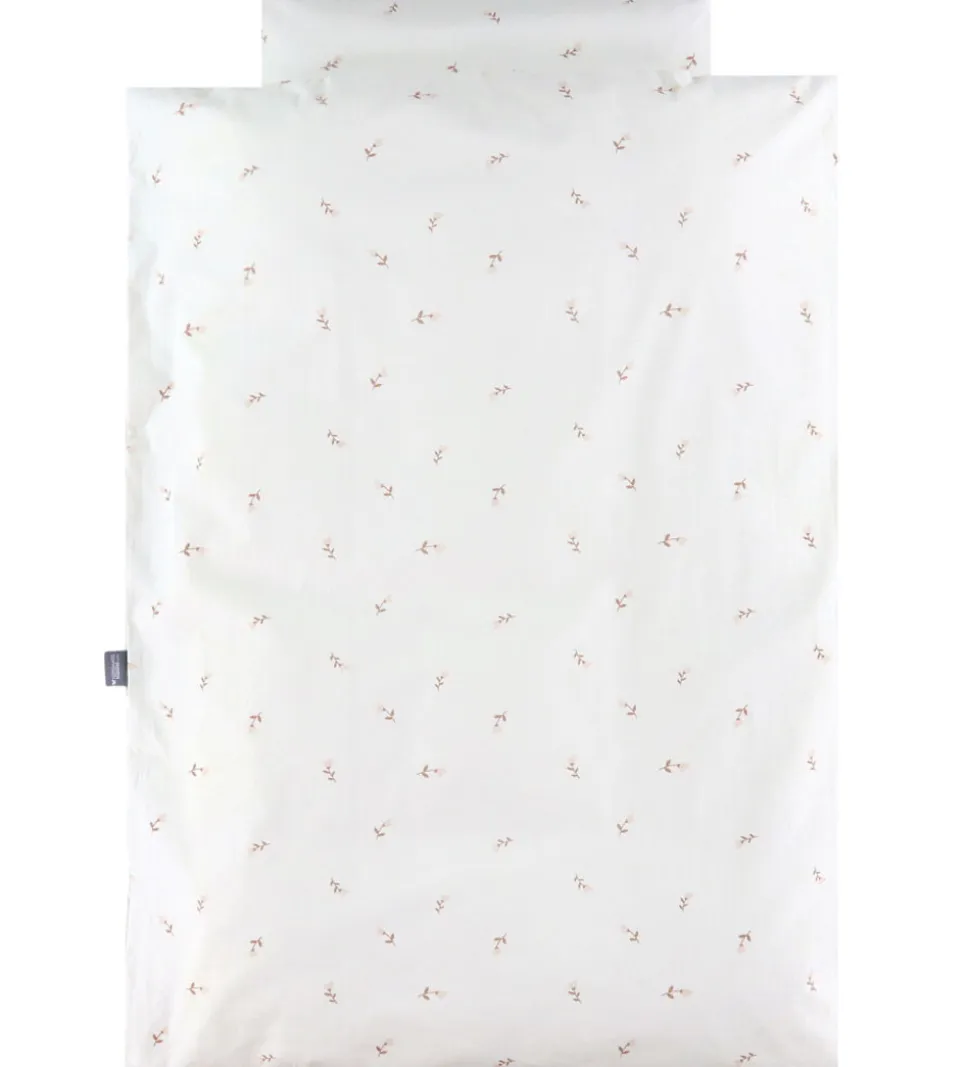 Fint Nørgaard Madsens sengetøj i hvid med et alloverblomsterprint i brune og rosa nuancer.