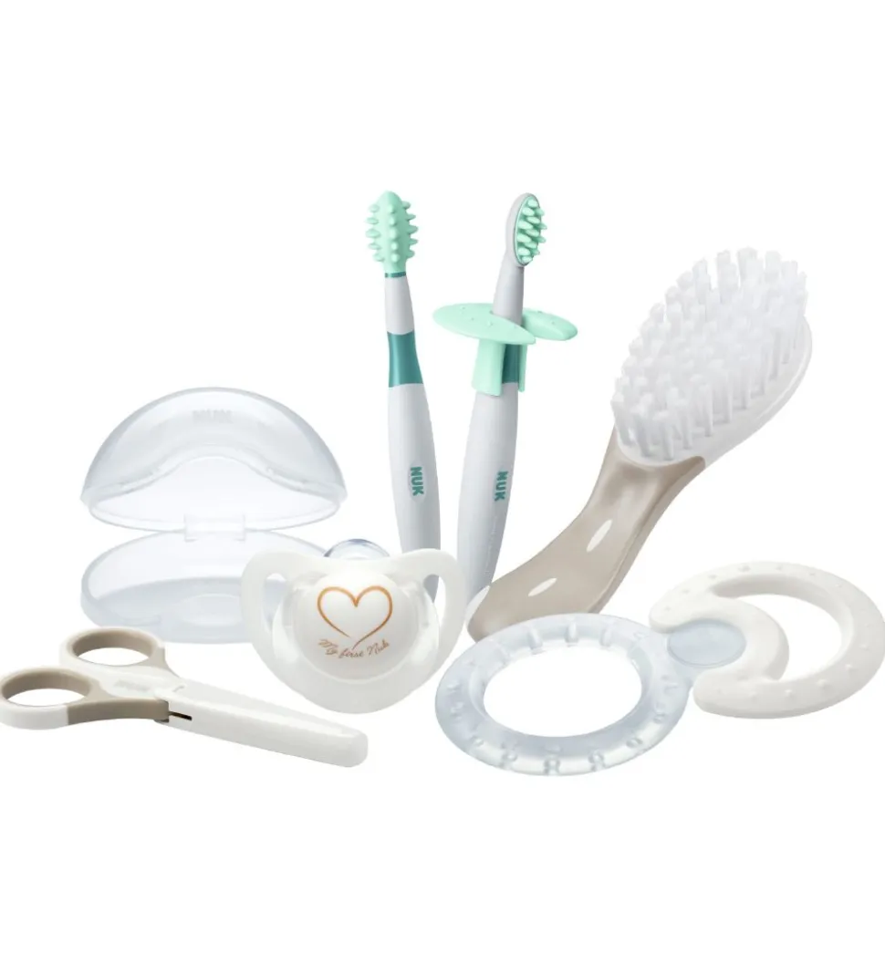 Praktisk Nuk startpakke med plejetilbehør til den lille baby.