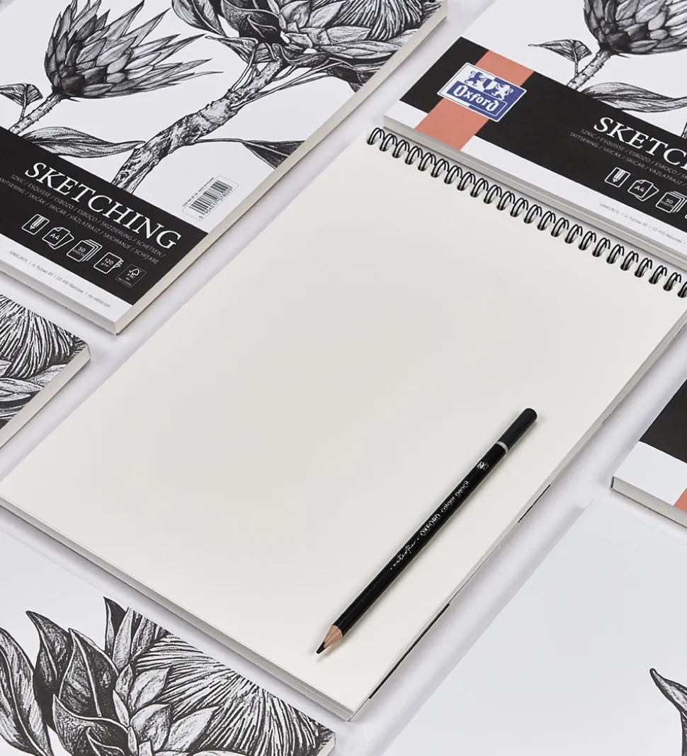 Oxford skitseblokken har spiralryg og den er perfekt til blyantstegninger. Papirets kvalitet er på 120 g/m2.