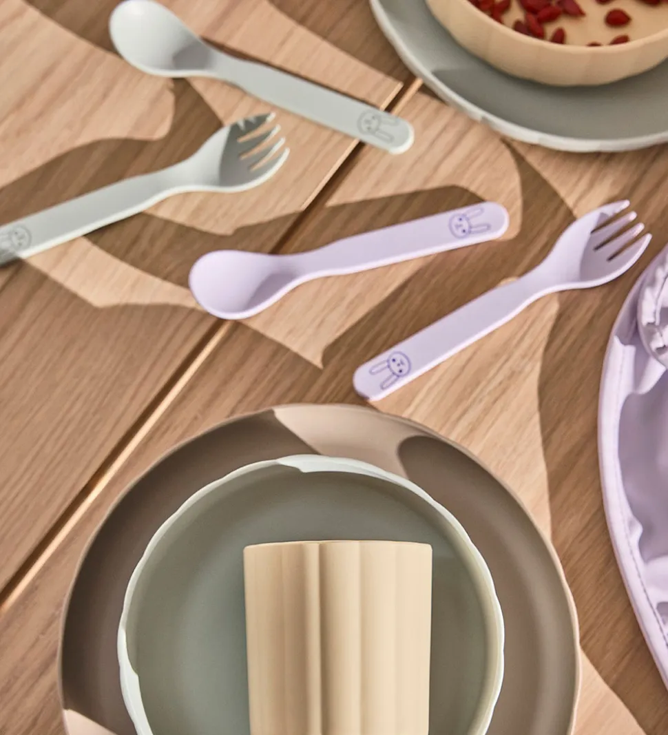 Pænt OYOY børnebestik i lavendellilla med print af kaniner i enden af grebet.