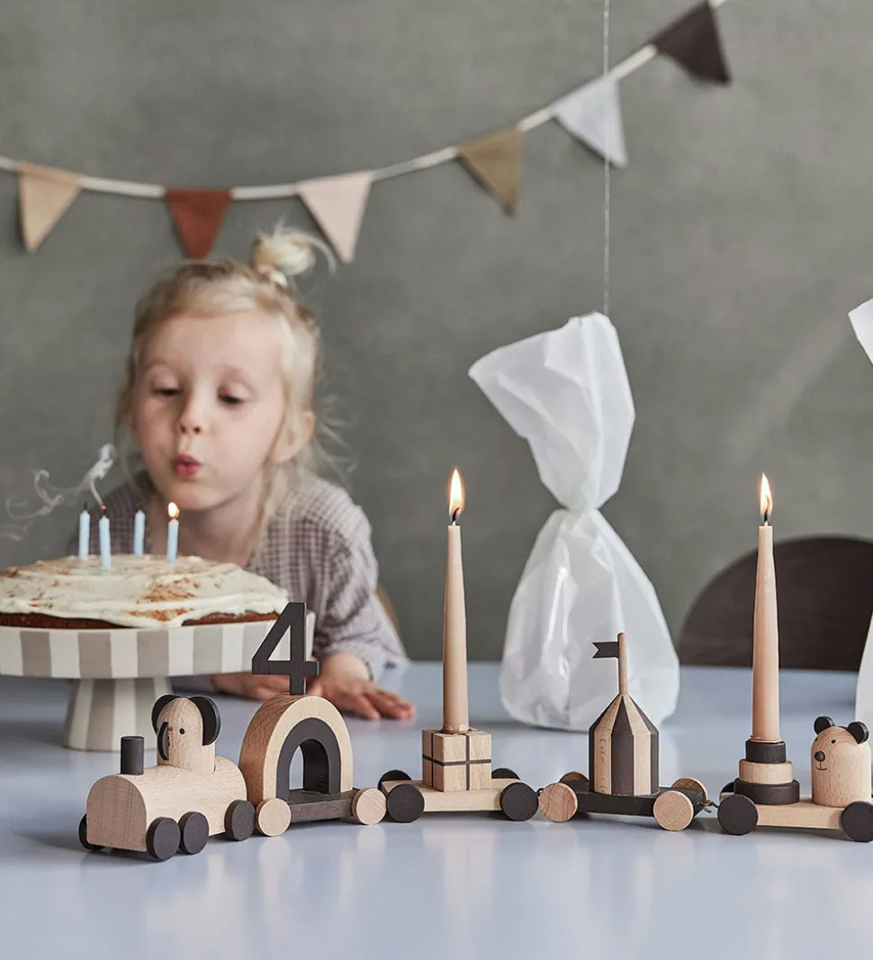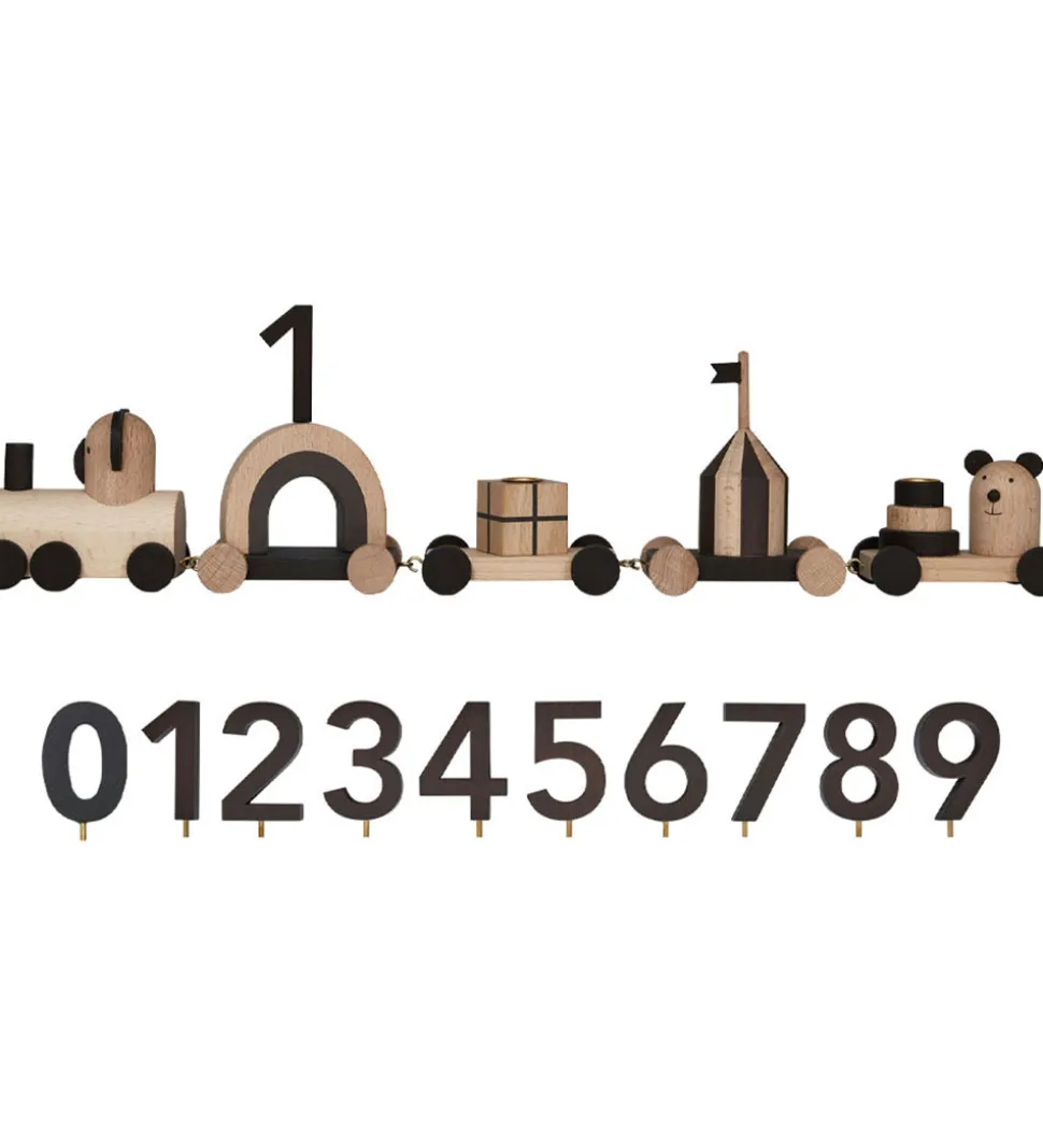 OYOY fødselsdagstoget er en fin dekoration til fødselsdagsbordet. Sættets dele kan hægtes fast til hinanden, og tre af delene har et hul på toppen, som henholdsvis passer til to lys og et tal, som kan kombineres til barnets alder. Tallene fra 0-9 medfølger.