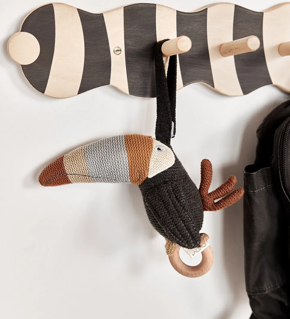 Fin OYOY knagerække af træ formet som en larve med mørke detaljer.