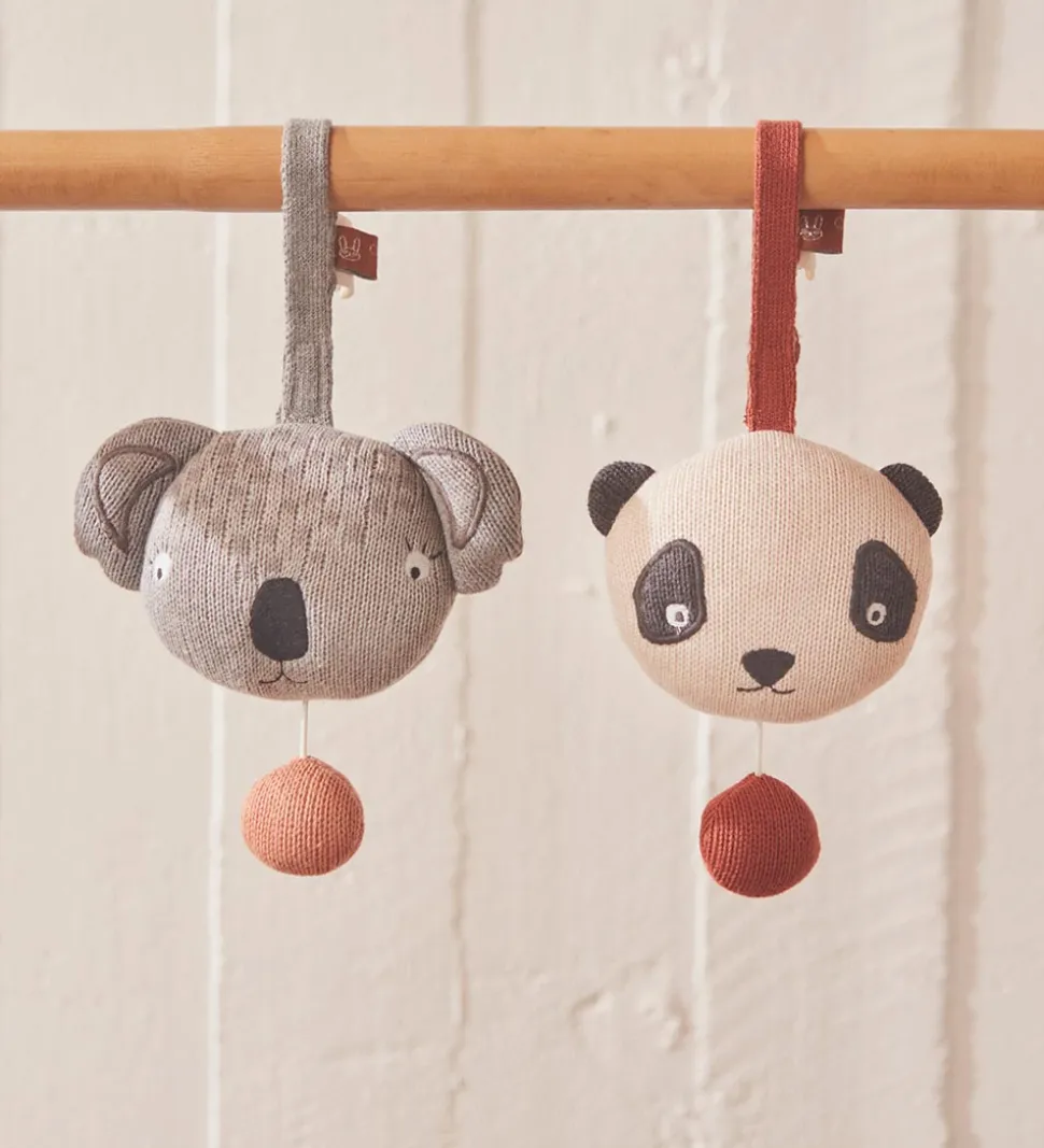 OYOY musikuroen hænges let op med en velcrostrop i toppen og er underholdende for de små. I bunden er der en kugle, som starter musikken når man trækker i den og er dejligt beroligende.