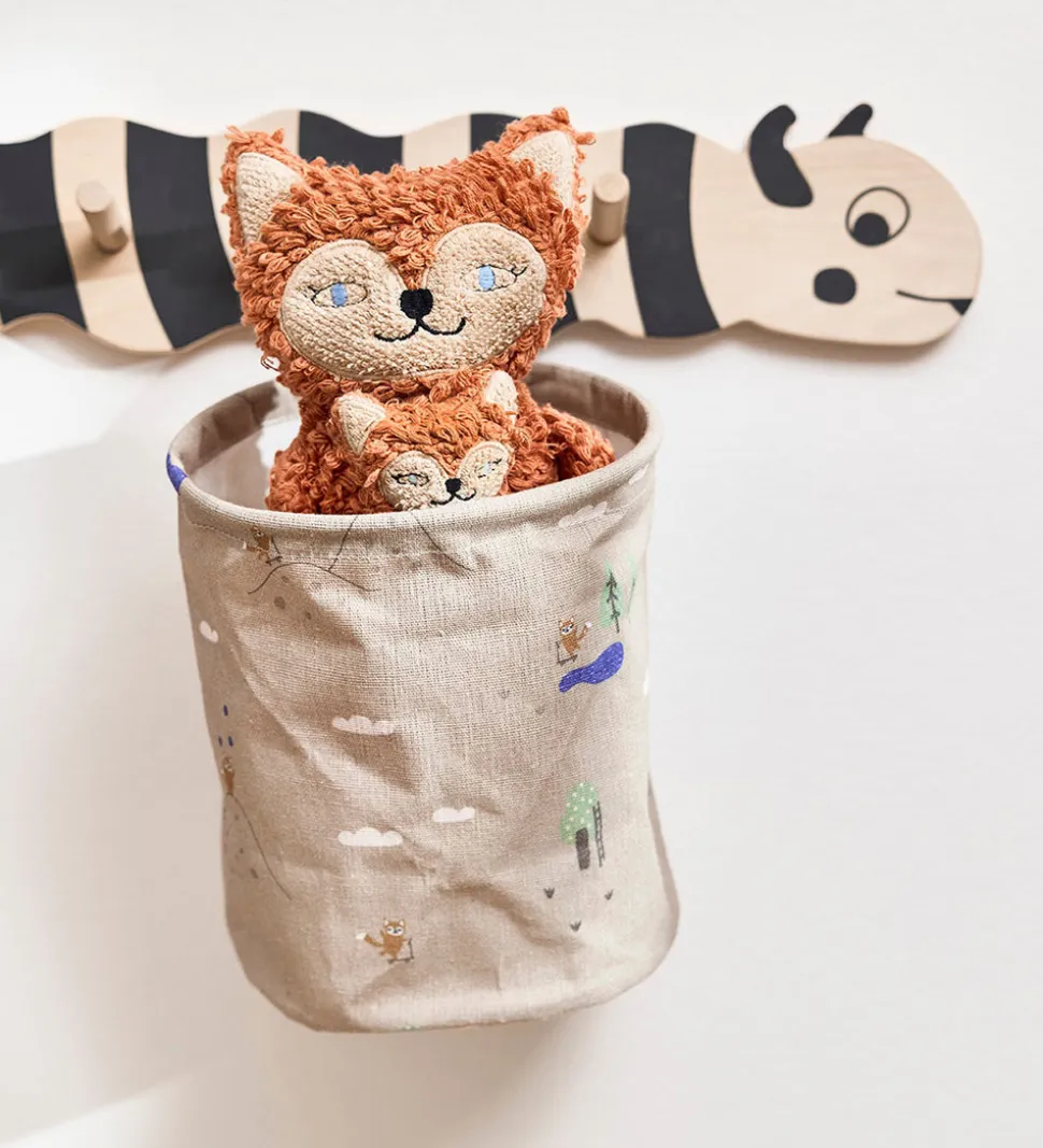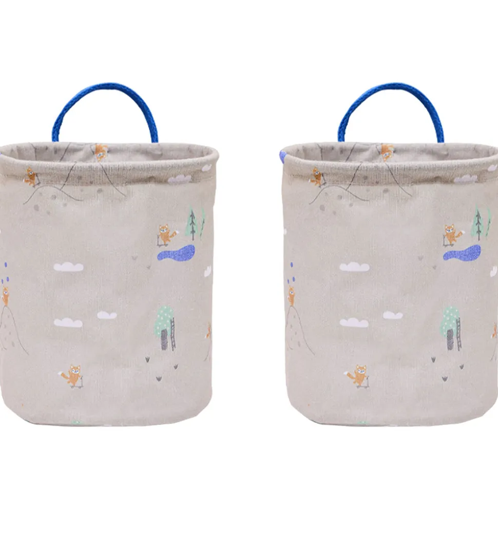 Pæne OYOY opbevaringskurve i gråbeige med et sødt ræveprint samt en blå hank.