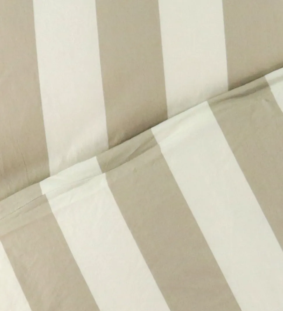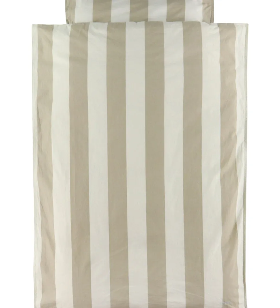 Flot OYOY sengetøj i stribet beige og råhvid.