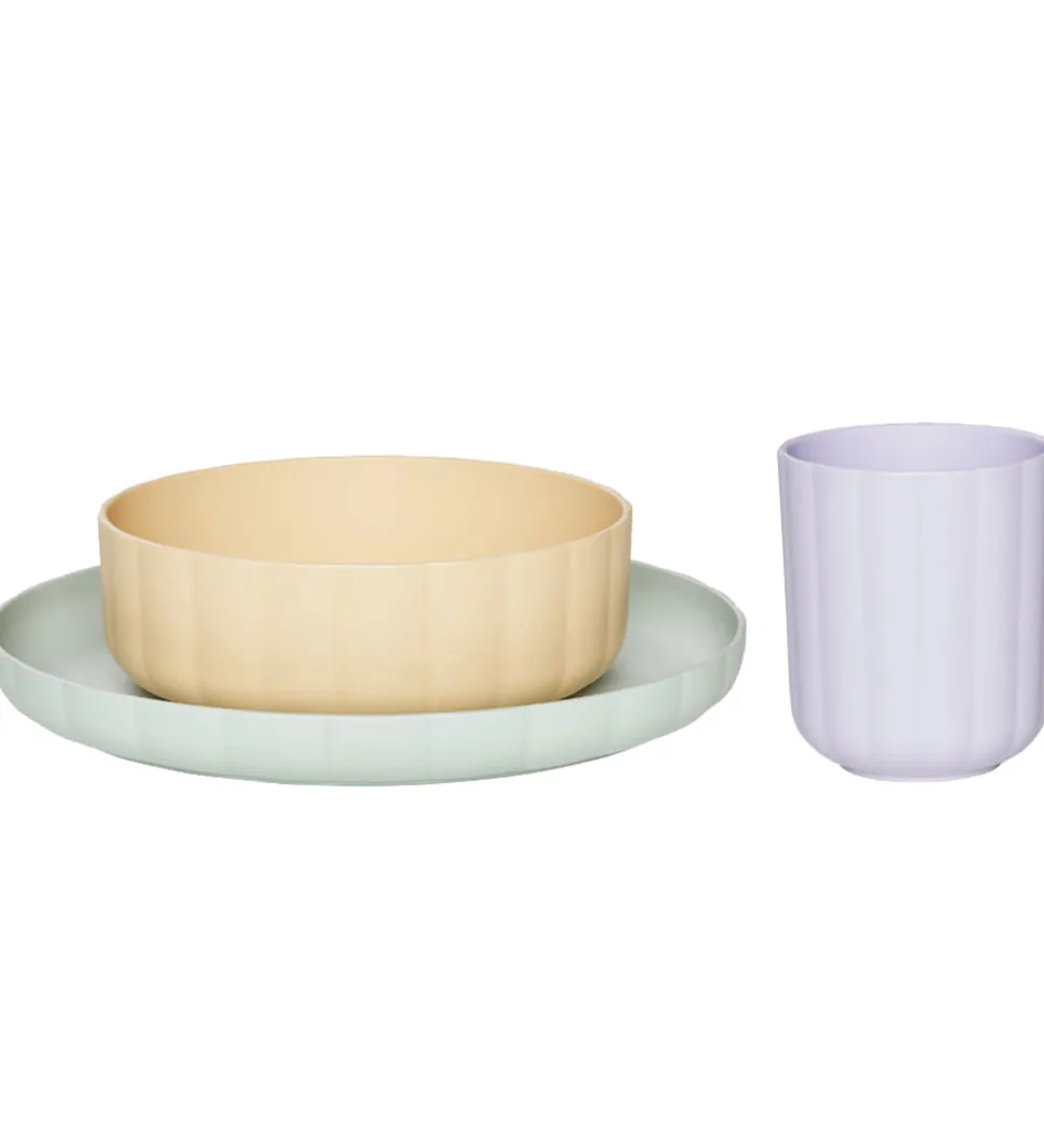 Fint OYOY spisesæt med en mintgrøn tallerken, en vaniljehvid skål og en lavendellilla kop.