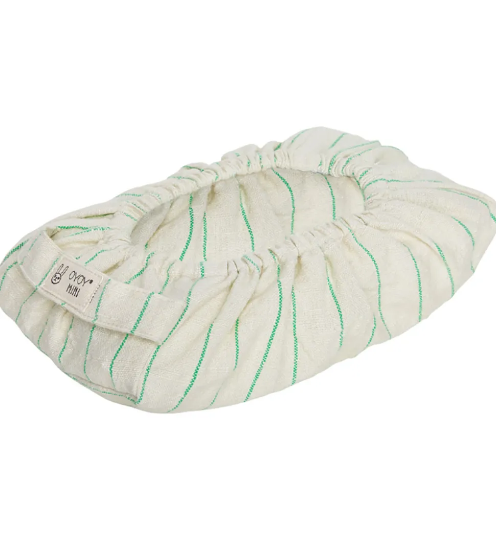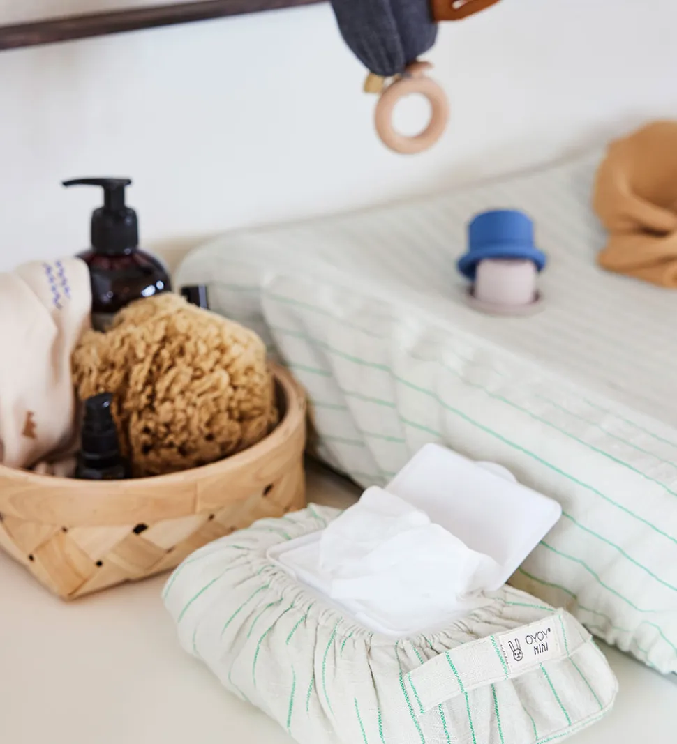Fin OYOY vådserviet etui i cremehvid med smalle striber i grøn.