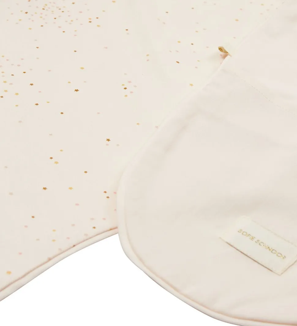 Smart Petit by Sofie Schnoor ammepudebetræk i rosa, med stjerner i rosa og gule nuancer. Bagpå er en hvid patch, med mærkets navn i guld på foldeåbningen.