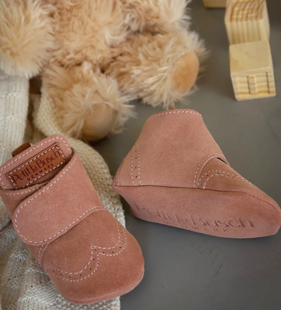 Søde Petit La Busch skindfutter i støvet rosa ruskind med fine syningsdetaljer.