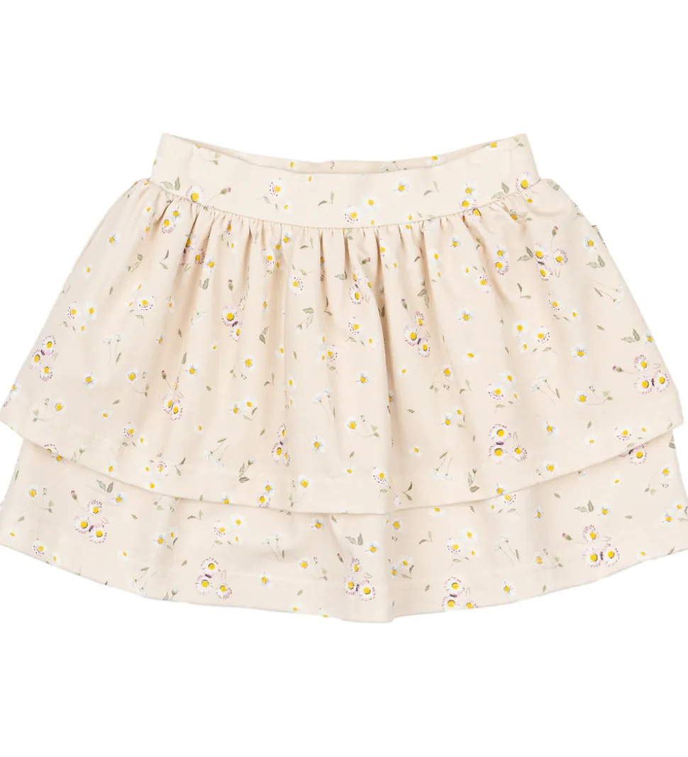 Charmerende Petit Piao nederdel i en lys, cremefarvet nuance med et delikat blomsterprint i hvide, lilla og grønne nuancer.