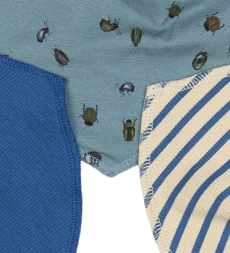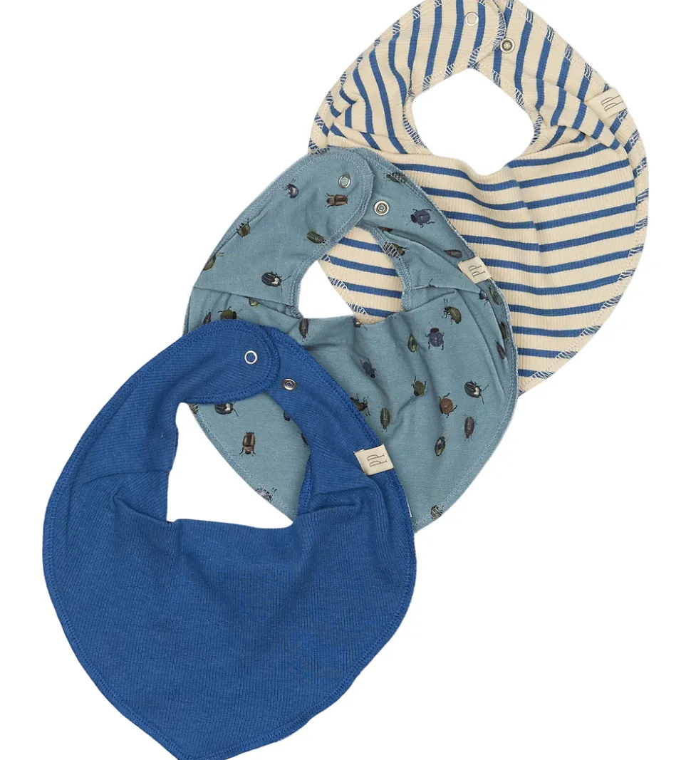 Den ene er blå, mens den anden er blå med et charmerende print af små insekter. Den tredje savlesmæk har et klassisk design med blå og creme striber. Savlesmækkene fra Petit Piao har trykknapper i nakken med justerbare størrelser.