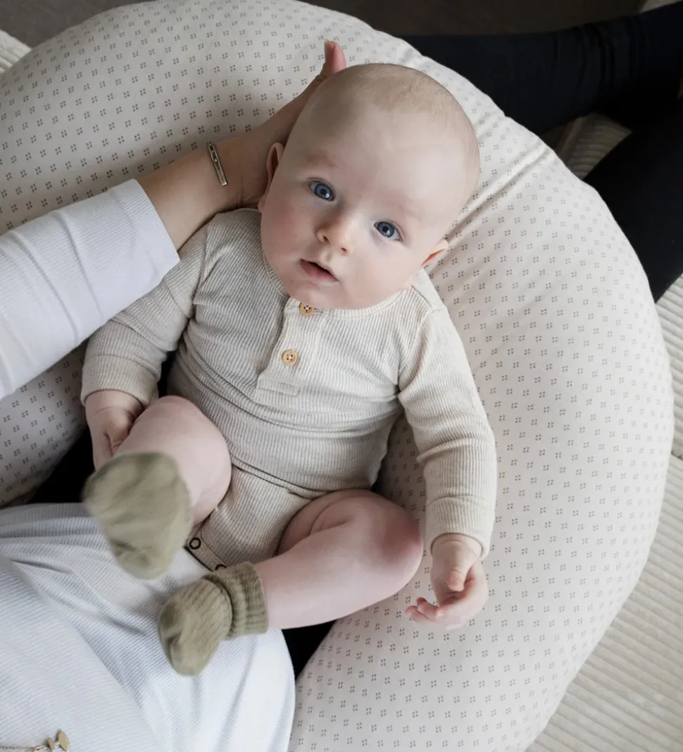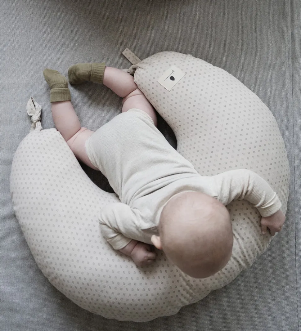 Pine Cone ammepuden er formet som en halvmåne, så den er behagelig støtte for både mor og baby, når der ammes eller som en sovepude eller lændestøtte til gravide. I hver ende af ammepuden er der fine bindebånd, så den kan lukkes sammen.
