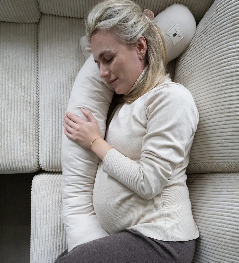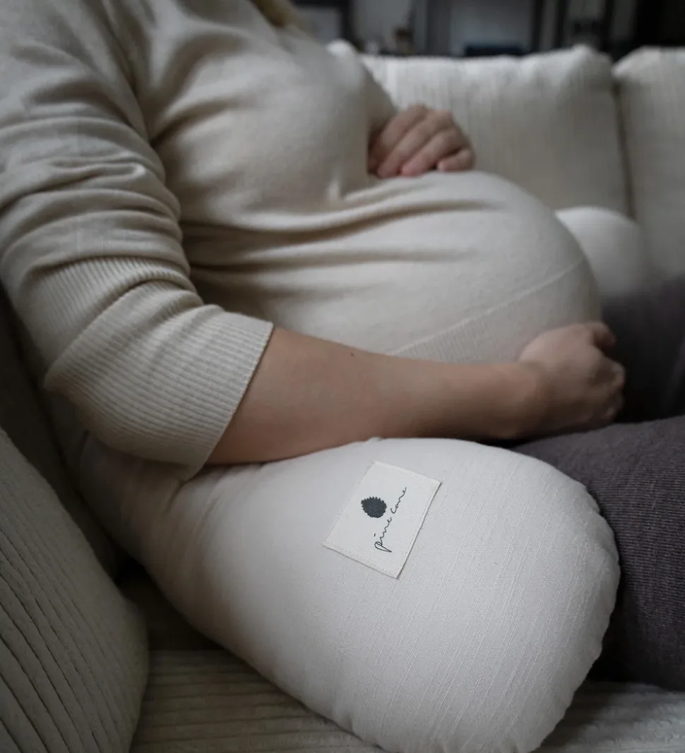 Pine Cone graviditetspuden har en lang, rund form med et fast og blødt fyld. Puden støtter den gravide i forskellige stillinger, når hun skal sidde eller sove.
