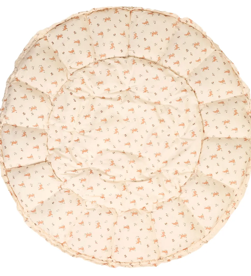 Flot Play&Go legetæppe i en lys beige nuance med søde print af kaniner og blomster på overfladen.
