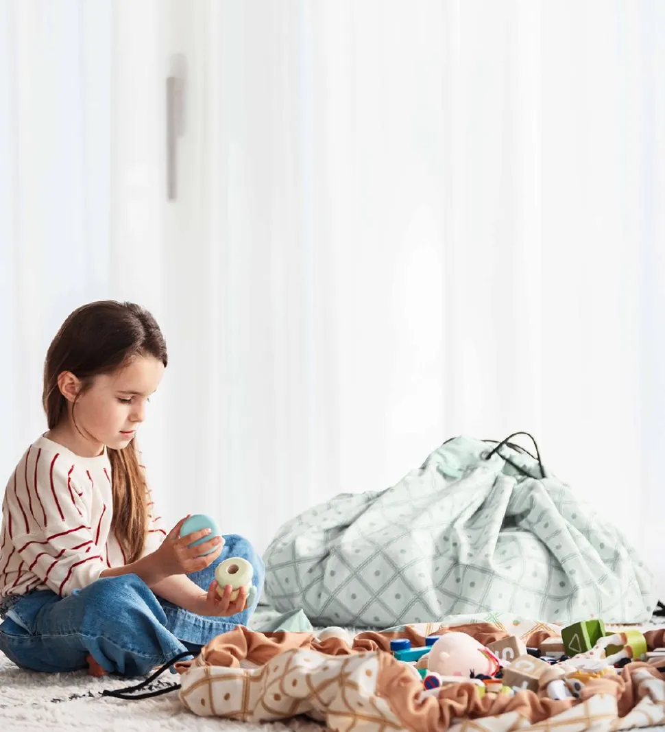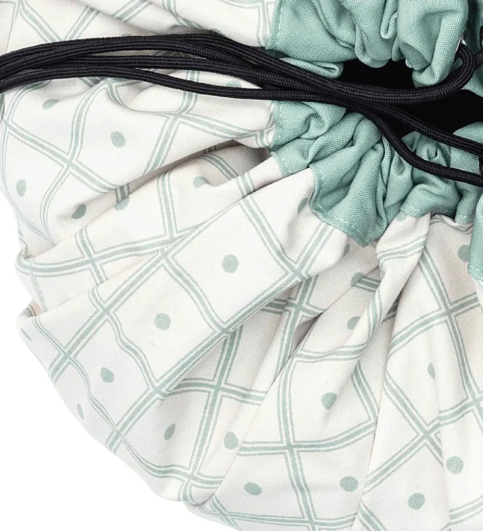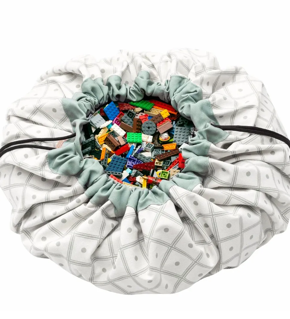 Play&Go legetøjstæppet er et stort cirkelformet stykke stof med en løbegang hele vejen rundt med en sort snor, så man kan snøre tæppet sammen til en pose. I posen kan man opbevare sit legetøj, og når børnene synes, at legetøjet skal med ind i stuen, kan posen åbnes og legetæppet folder sig ud. Bagefter er det hurtigt og nemt at rydde op og lægge på plads.