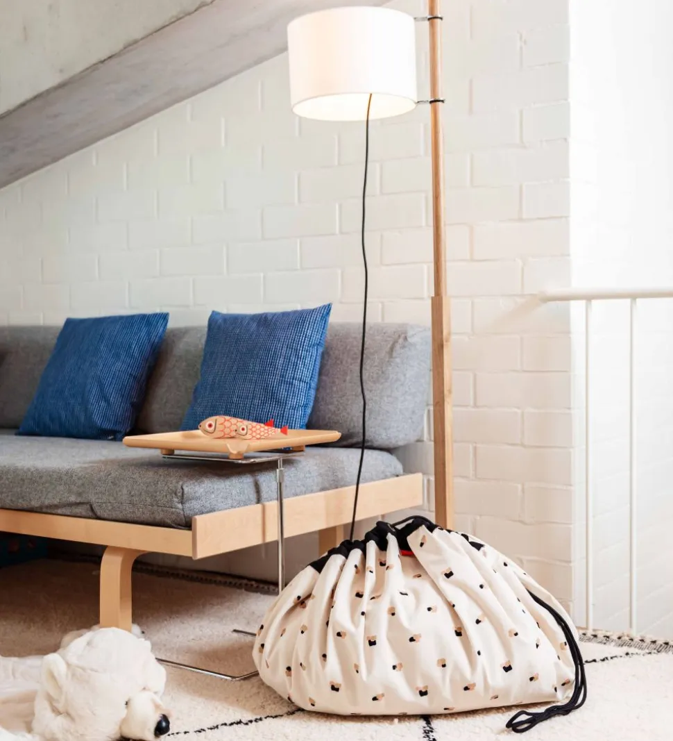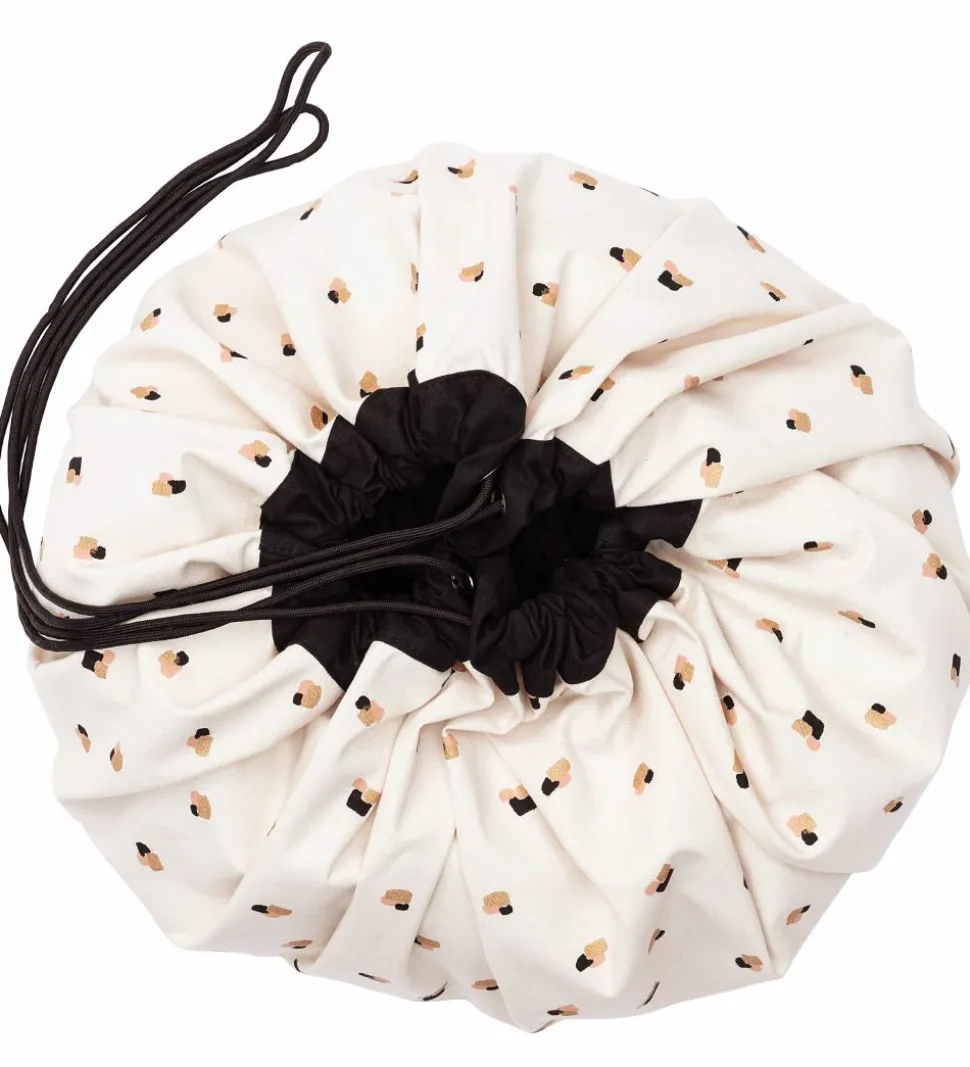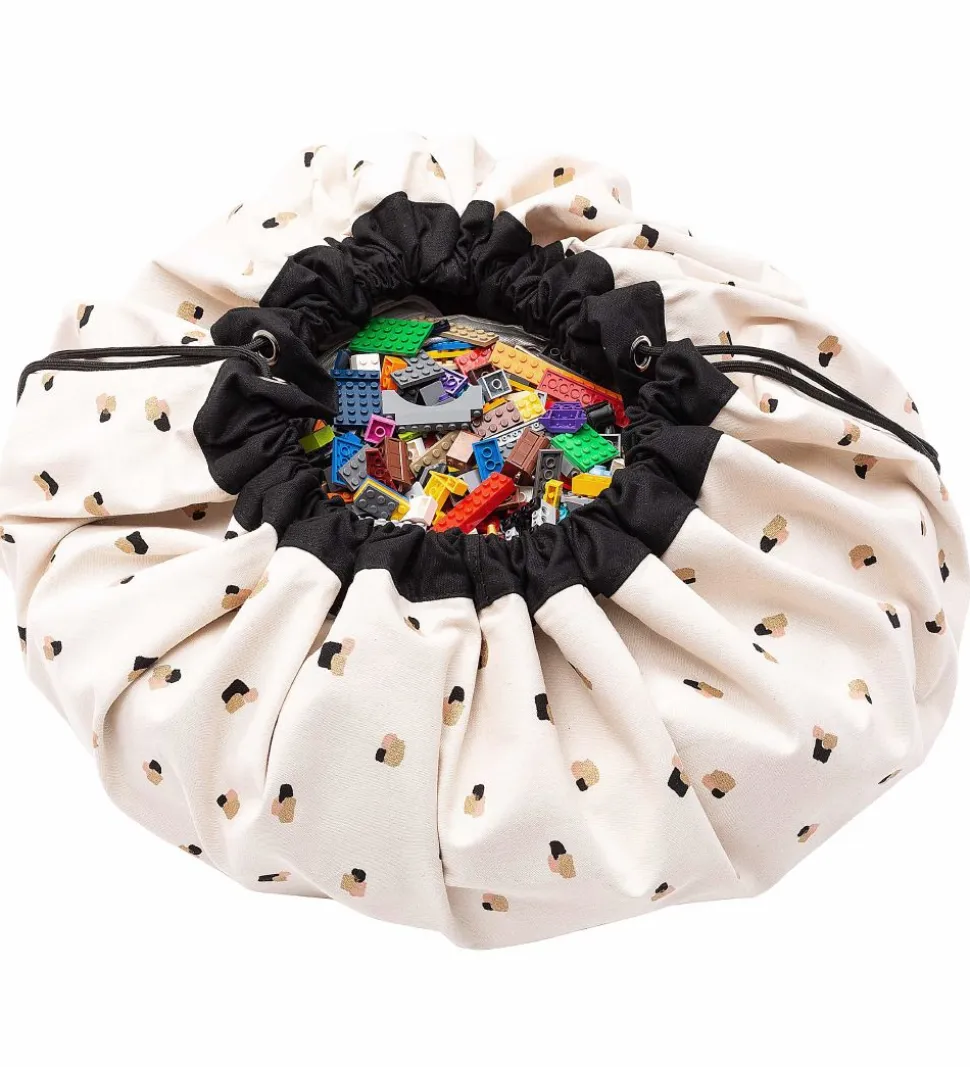 Play&Go legetøjstæppet er et stort cirkelformet stykke stof med en løbegang hele vejen rundt med en sort snor, så man kan snøre tæppet sammen til en pose. I posen kan man opbevare sit legetøj, og når børnene synes, at legetøjet skal med ind i stuen, kan posen åbnes og legetæppet folder sig ud. Bagefter er det hurtigt og nemt at rydde op og lægge på plads.