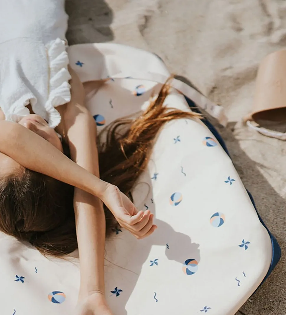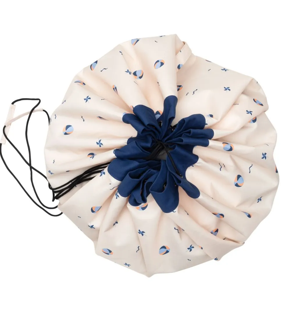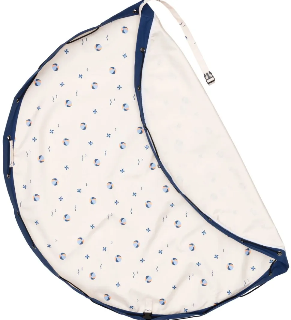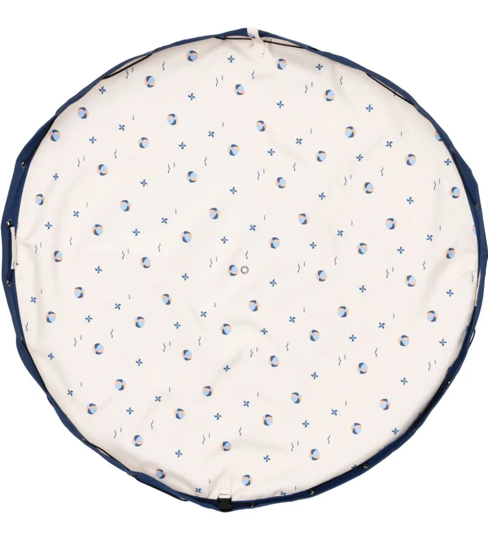 Praktisk Play&Go legetøjstæppe til udendørs aktiviteter i cremehvid, med balloner og vindmøller i blå nuancer, i en lækker PU-kvalitet.