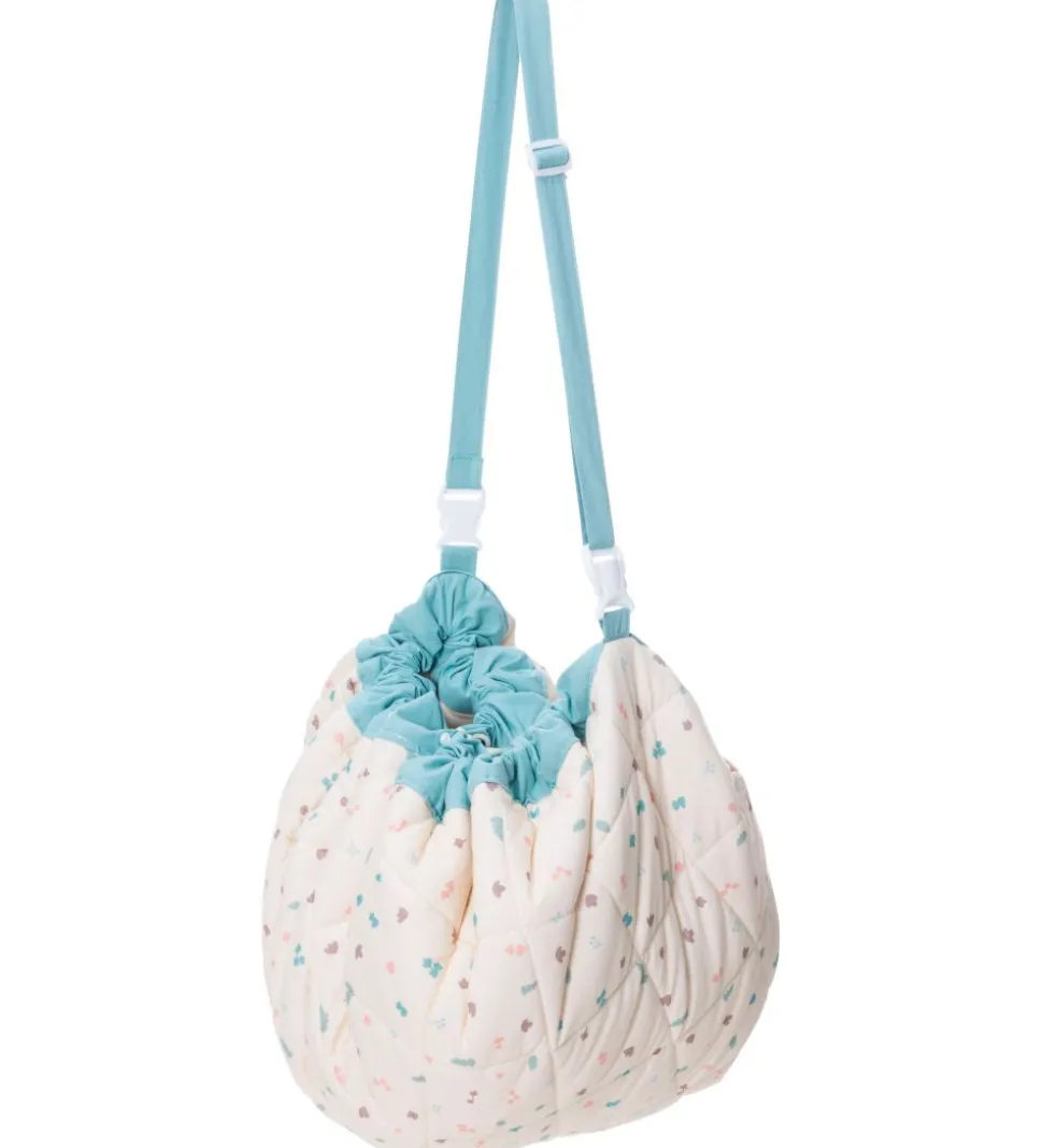 Play&Go legetøjstæppet er et stort cirkelformet stykke stof med en løbegang hele vejen rundt med en sort snor, så man kan snøre tæppet sammen til en pose. I posen kan man opbevare sit legetøj, og når børnene synes, at legetøjet skal med ind i stuen, kan posen åbnes og legetæppet folder sig ud. Bagefter er det hurtigt og nemt at rydde op og lægge på plads. Posen har en lang hank, så den kan hænges over barnevognen og tages med på farten.