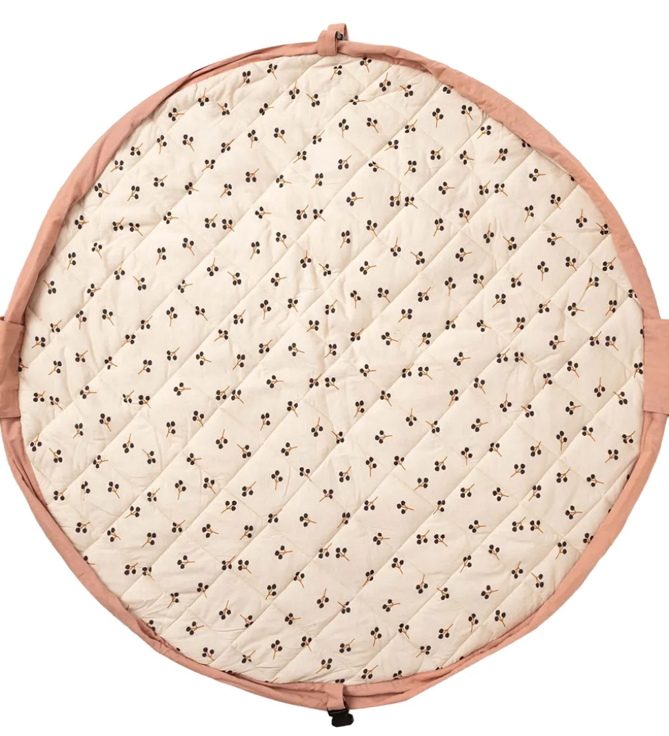 Flot Play&Go x Moulin Roty legetøjstæppe i cremehvid med rosa kanter og med forskellige print på inder- og ydersiden. Indersiden har et pritn af en sød kanin i fint tøj og med blomster, mens ydersiden har et alloverprint af lysebrune grene med mørkeblå bær.
